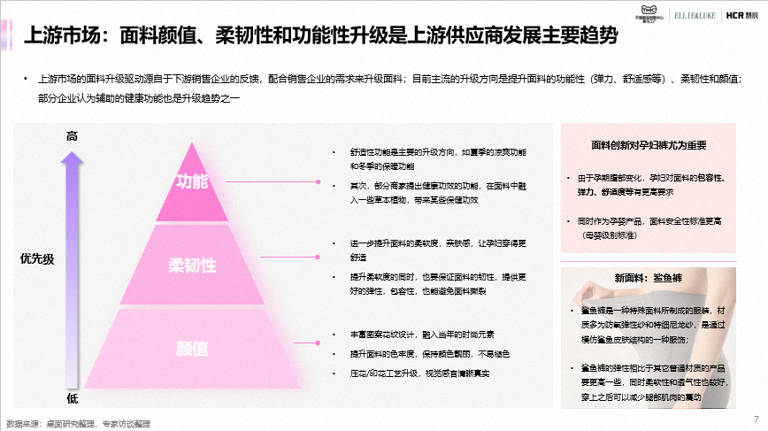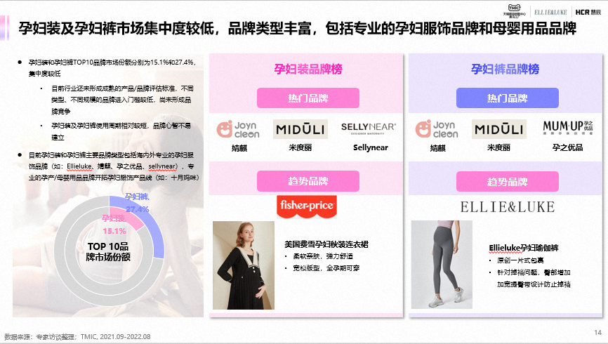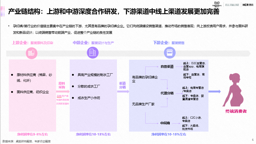 上游市场中,面料颜值、柔韧性和功能性升级是供应商发展主要趋势;在中游市场主要是基于设计元素的微创新做新品研发,开发节奏相对更快;而下游市场商家更注重线上渠道铺设和投放,其中天猫、淘宝是主要的线上渠道。当前,孕妇装及孕裤装,以平价市场为主,但逐渐开始呈现高端化趋势,孕妇装及孕裤装品牌类型丰富,市场集中度较低,包括专业的孕妇服饰品牌和母婴用品品牌。