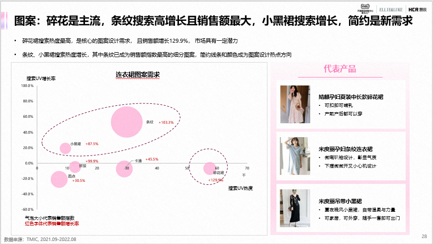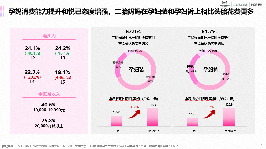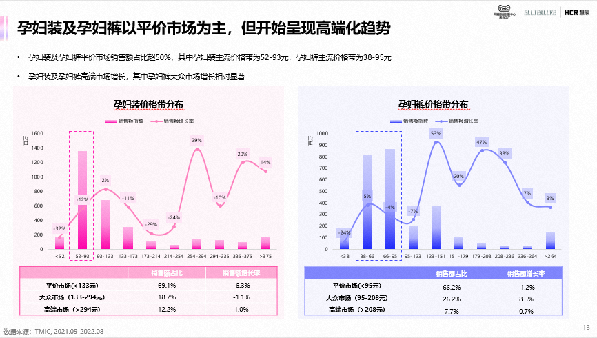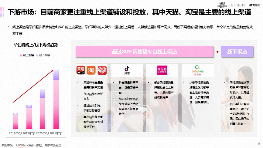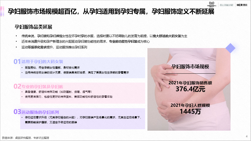 TMIC联合ELLIE&LUKE、慧辰共同发布《孕妇服饰行业趋势报告》。孕妇服饰市场规格超百亿,从孕妇适用到孕妇专属,孕妇服饰定义不断延展。生育政策、行业新策、消费升级、女性主义和技术革新驱动孕妇服饰发展,形成了上游和中游深度合作研发,下游渠道则完善线上渠道发展。