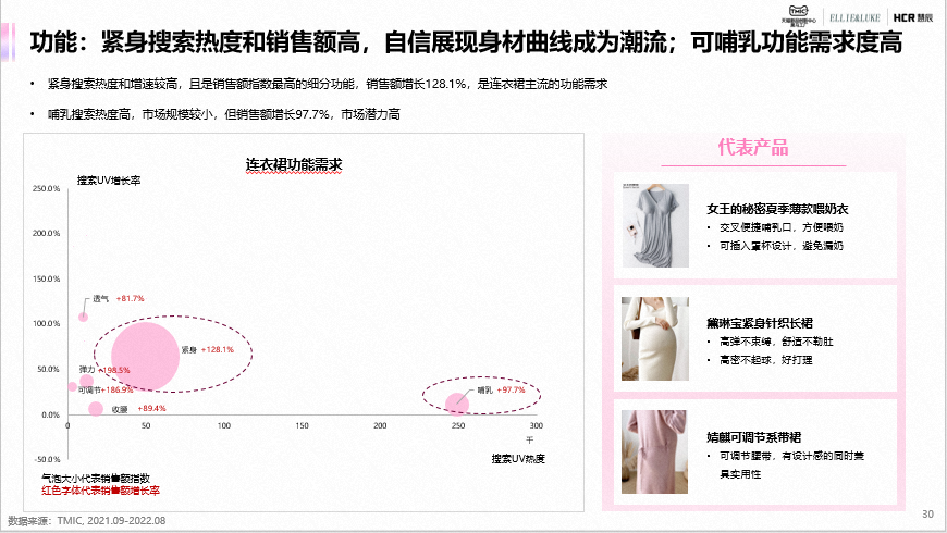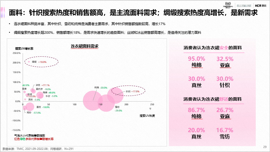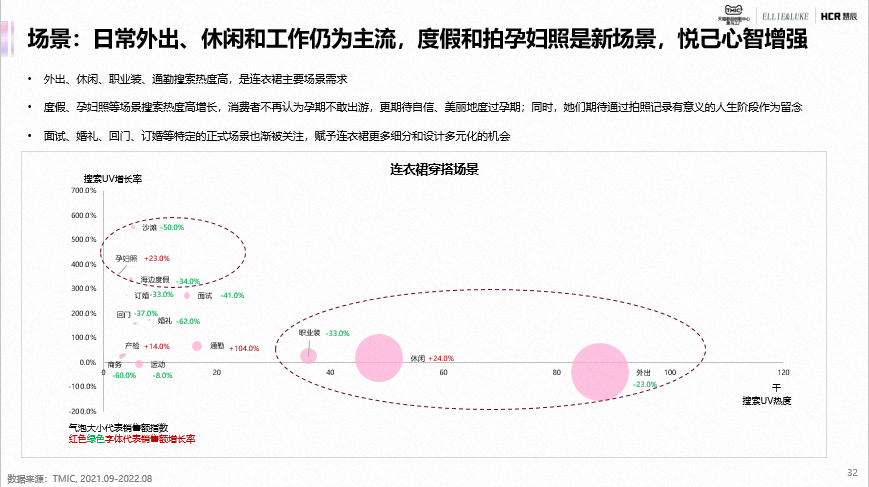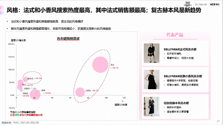 连衣裙在款式上以连衣裙+打底衬衫形式的两件套热度和销售最高,且销售额增长103%,市场吸引力强;以法式为主的风格是当下主流,同时,对功能延展、舒适升级和悦己场景的需求热度较高。