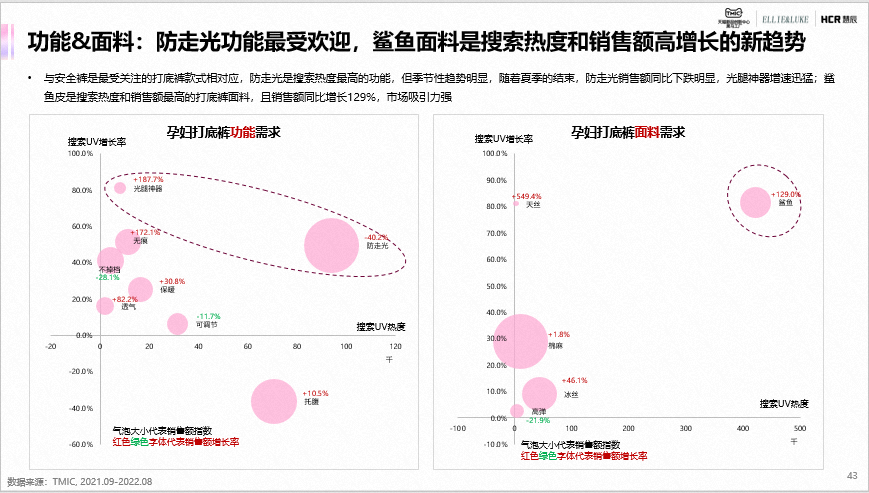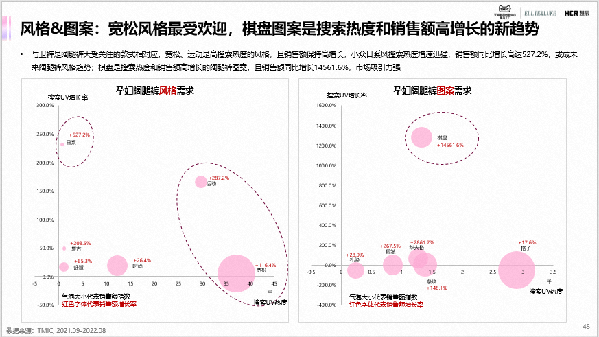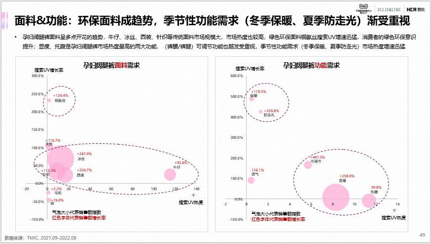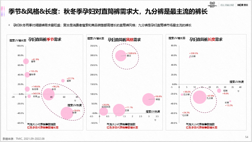 低腰阔腿裤是孕妇阔腿裤销售额最高的款式,且销售额同比增长194.35%,市场吸引力强;款式多元、宽松运动风、绿色环保面料和季节性功能是阔腿裤品类市场的主要需求。直筒裤最受欢迎的款式是烟管裤,同比销售额增长190.1%,市场吸引力强;款式多元、季节性面料、可调节功能和复古风潮是直筒裤品类市场的主要需求。来源:TMIC 天猫新品创新中心