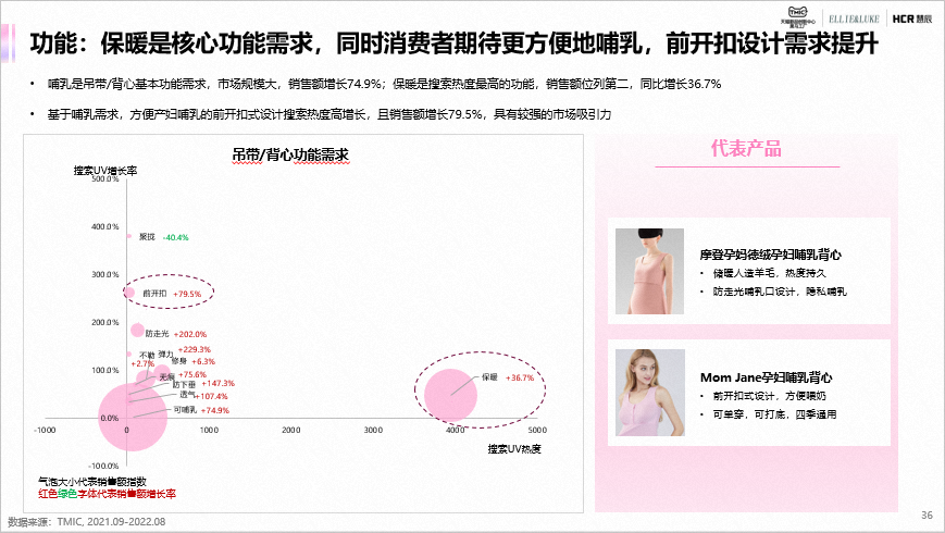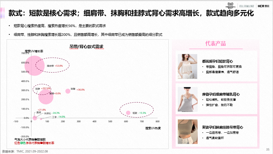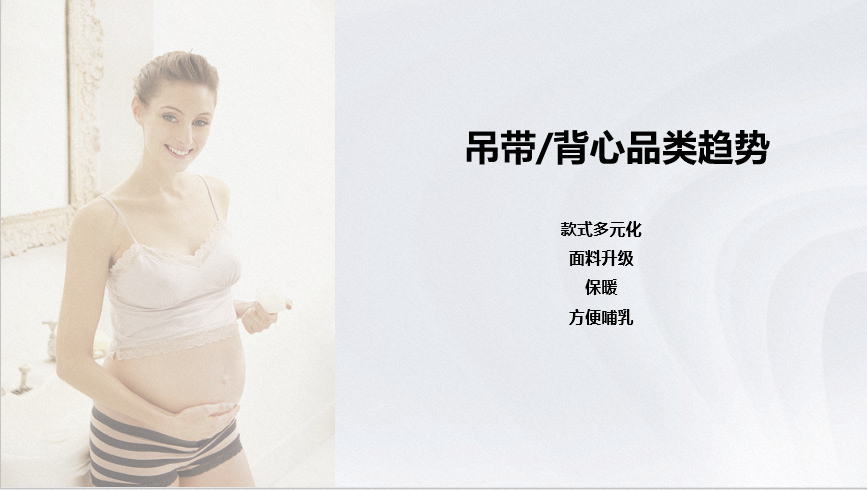 吊带/背心在款式上短裤背心搜索热度高,是主要的款式需求;在款式多元化、面料升级、保暖和哺乳上是品类市场的主要需求。