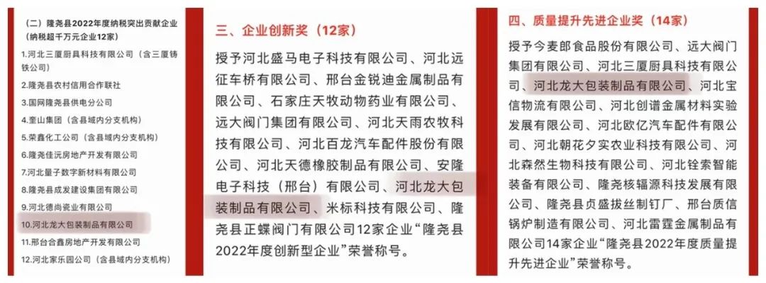 2022年2月8日,隆尧县三干会对商会理事单位:河北龙大包装制品有限公司进行了表彰。荣获隆尧县2022年度“纳税突出贡献企业”、“企业创新奖”、“质量提升先进企业奖”三大荣誉称号,同时,以纳税1201万元位列隆尧县纳税超百万元企业光荣榜第12名。