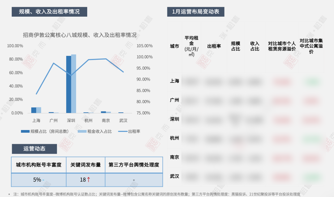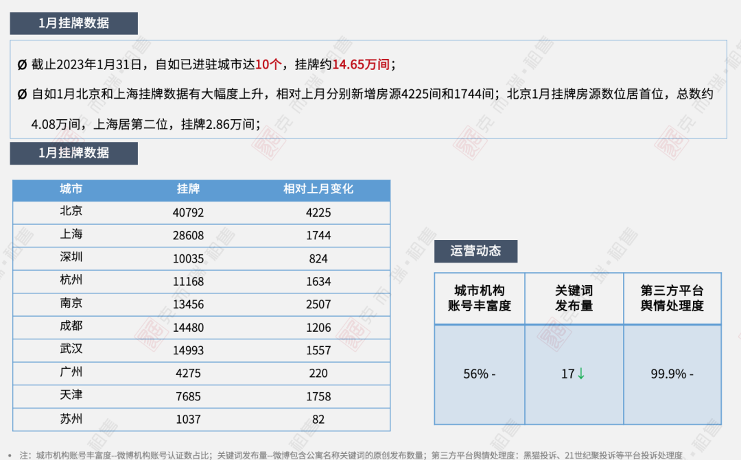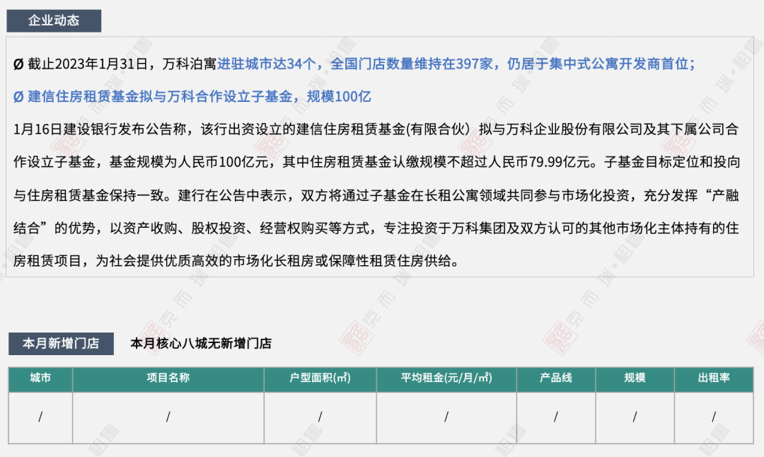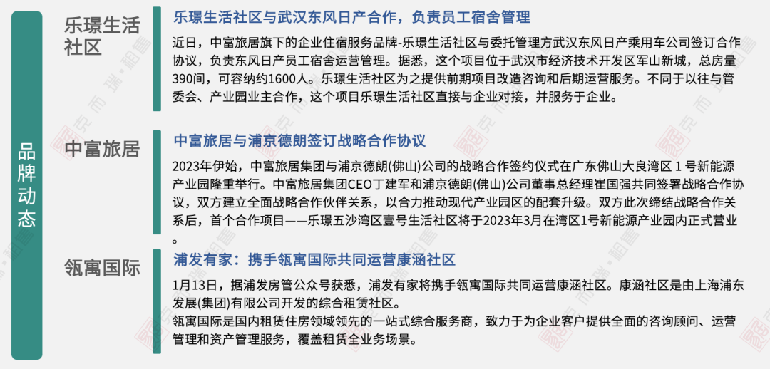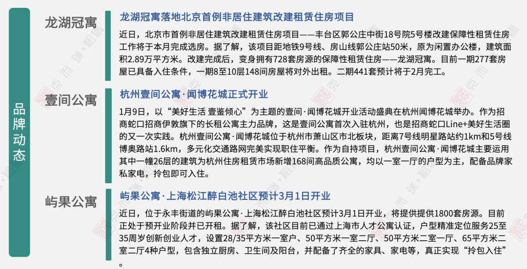 品牌动态方面:1月,龙湖冠寓落地北京首例非居住建筑改建租赁住房项目;杭州壹间公寓·闻博花城正式开业;屿果公寓·上海松江醉白池社区预计3月1日开业;乐璟生活社区与武汉东风日产合作,负责员工宿舍管理;中富旅居与浦京德朗签订战略合作协议;浦发有家携手瓴寓国际共同运营康涵社区。