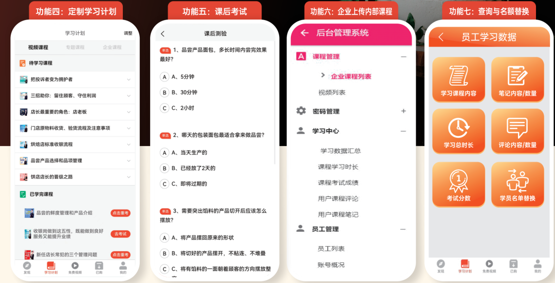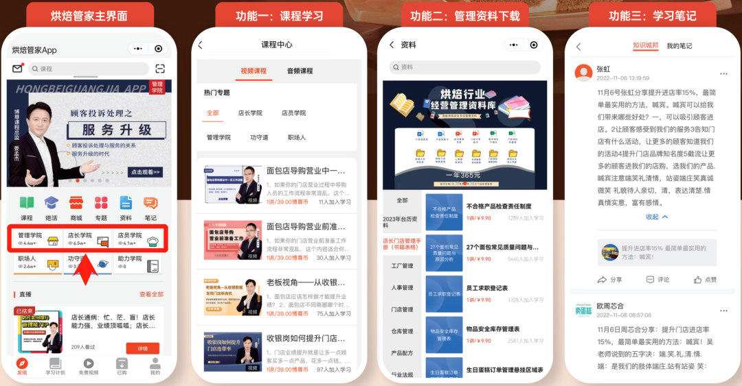 ㈡ 课程体系:《店员学院》《店长学院》《管理学院》《专题课程》大量行业专业课程,助力饼店企业构建知识循环中枢,提高各岗位各级员工专业能力;