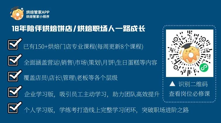 点击链接,查看平台全部内容(学院课程、专题课程、资料、免费视频/文章等),体验平台功能。如需了解烘焙管家全部后台功能,请联系客服15521225720(微信同号)。