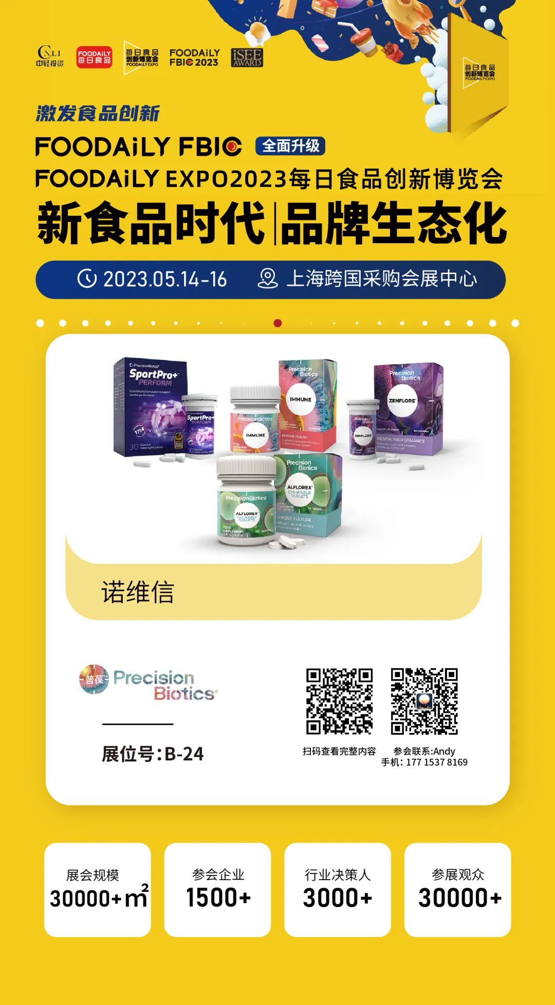 主要成分:长双歧杆菌35624®,异麦芽糖,微晶纤维素等主要特点:缓解肠易激综合症(IBS)症状,腹泻、便秘、气胀、腹痛等胃肠不适症状。温馨提示:若同时服用抗生素类药物,请至少间隔2个小时。请在开瓶的3个月内服用完本品为膳食补充剂不可替代药品。主要特点:研究证实长双歧杆菌PB-VIR™ 菌株调节免疫系统的感染反应机制,控制感染早期肺部病毒数量的增加;防止免疫系统过度反应引发感染,预防“细胞因子风暴”。维生素D有助于免疫系统的正常功能。温馨提示:若同时服用抗生素类药物,请至少间隔2个小时。请在开瓶的3个月内服用完本品为膳食补充剂不可替代药品。4、品名:SportPro+TMPERFORM烁弗乐运动益生菌主要成分:长双歧杆菌1714-Serenitas®,维生素B族适用人群:运动员及健康爱好者,成人和12岁及以上的儿童。主要特点:改善压力应对机制,减少精神疲劳,提高活力和敏捷度。温馨提示:若同时服用抗生素类药物,请至少间隔2个小时。请在开瓶的3个月内服用完本品为膳食补充剂不可替代约品第八届创博会(前Foodaily FBIC全球食品饮料创新大会)由Foodaily与中国轻工企业投资发展协会联合主办,活动将围绕产品&品牌创新的从0到1,从B到C的全链路,通过会议、展览、奖项三大板块以及特别策划活动,360°立体呈现产品创新、品牌创新、行业创新以及新消费创新。媒体商务合作:Amy(微信号:13701559246);转载授权及媒体合作:Jennifer(微信号:15151447934);加入社群:Cherry(微信号:15262433826)。