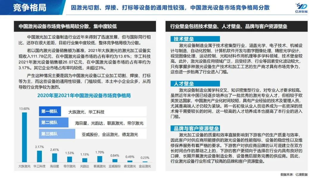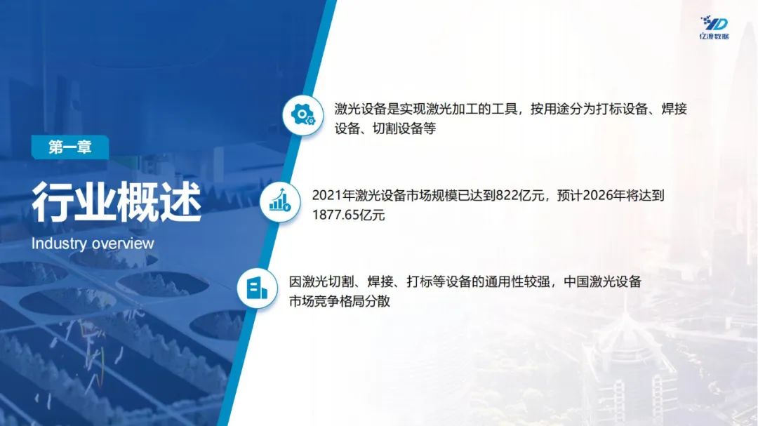 激光设备是实现激光加工的工具,按用途分为打标设备、焊接设备、切割设备等。2021年激光设备市场规模已达到822亿元,预计2026年将达到1877.65亿元。因激光切割、焊接、打标等设备的通用性较强,中国激光设备市场竞争格局分散。
