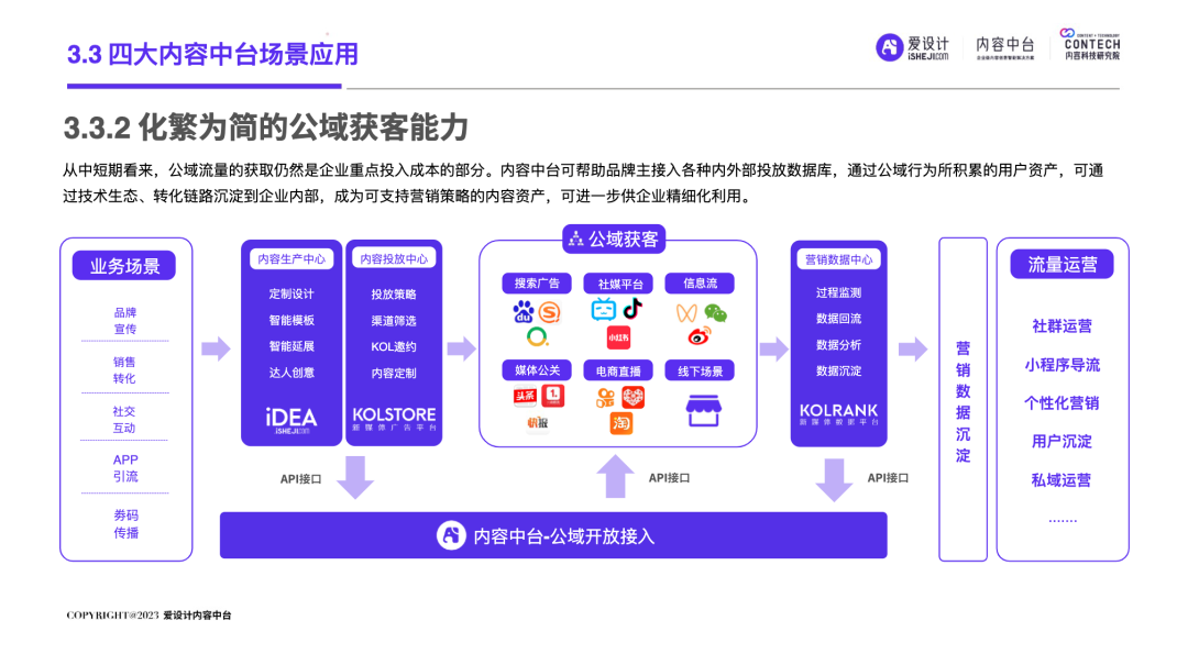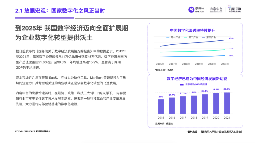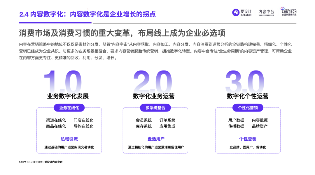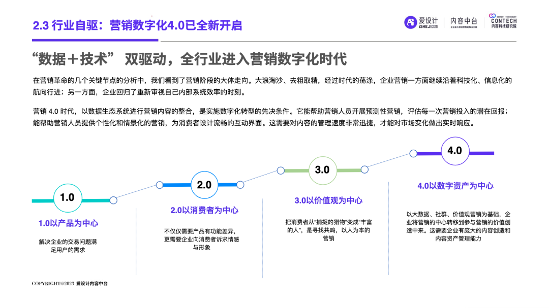 自2019年中国移动互联网用户发展见顶,叠加疫情双重因素的影响,数字化发生了重大变化:增量时代,中国市场,成长为一个产业链完善、企业营收规模庞大的商业帝国;狂奔之后,我国内外部经济运行环境十分复杂,企业面临消费增速放缓的压力,中国进入存量时代。在存量时代,企业营销面临的优质流量的存量竞争局面,围绕“效率”的厮杀日益激烈,长远可持续的降本增效成为企业发展的重要课题。渠道数字化、产品数字化已经被无数企业验证及应用,但唯独内容数字化成为一块“最难啃的骨头”!好消息是:一场针对AI的‘完美风暴’正在内容智造领域形成!也许未来,就会是AIGC的时代,而AI是现在以及未来直接生产内容的重要技术形式之一。企业创建强大的内容力,提前建设内容中台,成为每个伟大企业的必由之路。正如iPhone颠覆了手机行业,埃隆马斯克引领下的Open AI利用ChatGPT已经打开了内容生产的新形势!“不做数字化转型的企业就会在五年内消失”的预言到底会不会也成为现实?未来,企业的营销内容如何做?内容内外部流转效率如何提升?今天,由爱设计内容中台发起的内容科技研究院,联合微梦传媒、视觉中国、神策数据、科特勒增长实验室、见实科技、弯弓Digital、流量池研究所、极客邦、胖鲸、第一新声、执牛耳、馒头商学院、决策者零售研究院、Fmarketing、iDigital China、Digital Frontier首席数字官、鸟哥笔记、TopMarketing……(排名不分先后)共同发布《2023企业内容中台白皮书 》(以下简称“白皮书”)。白皮书深入洞察营销数字化趋势,基于一定数量的数据样本,整合了内容中台的市场化表现,旨在为企业主2023年数字化转型提供内容中台的信息支持,为企业营销深度赋能。目录: