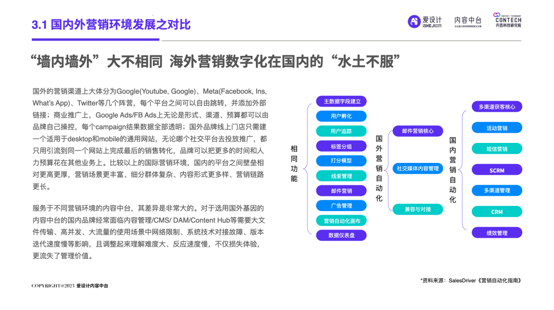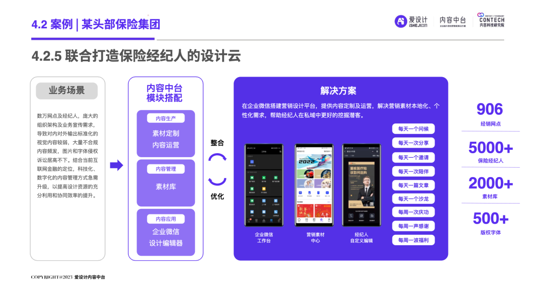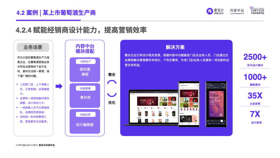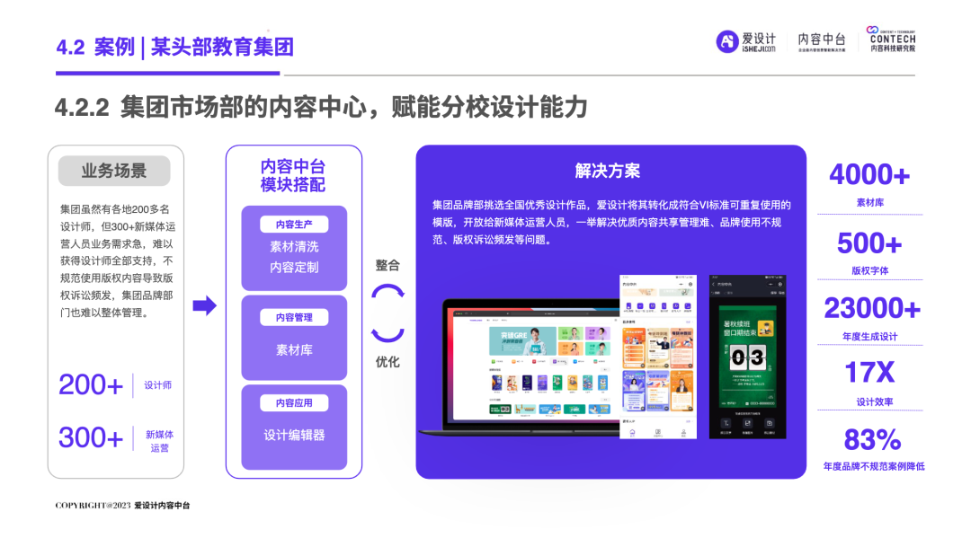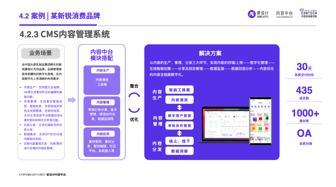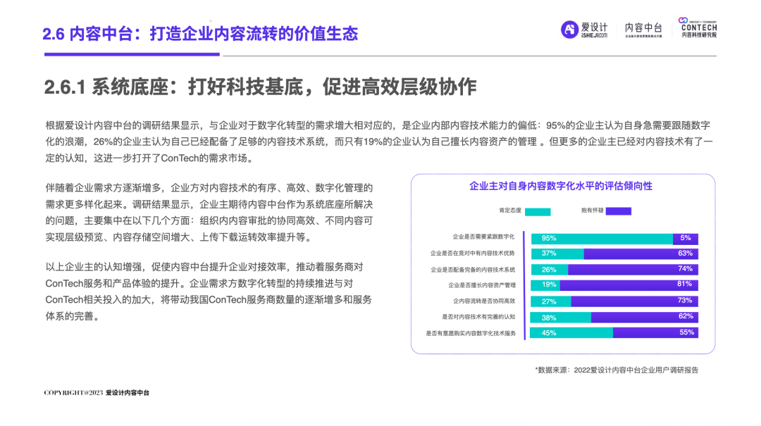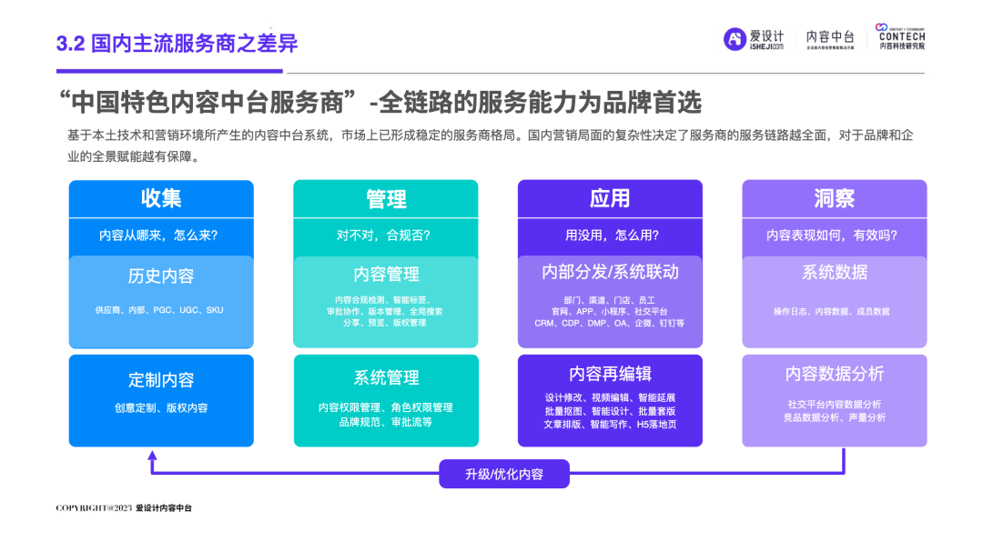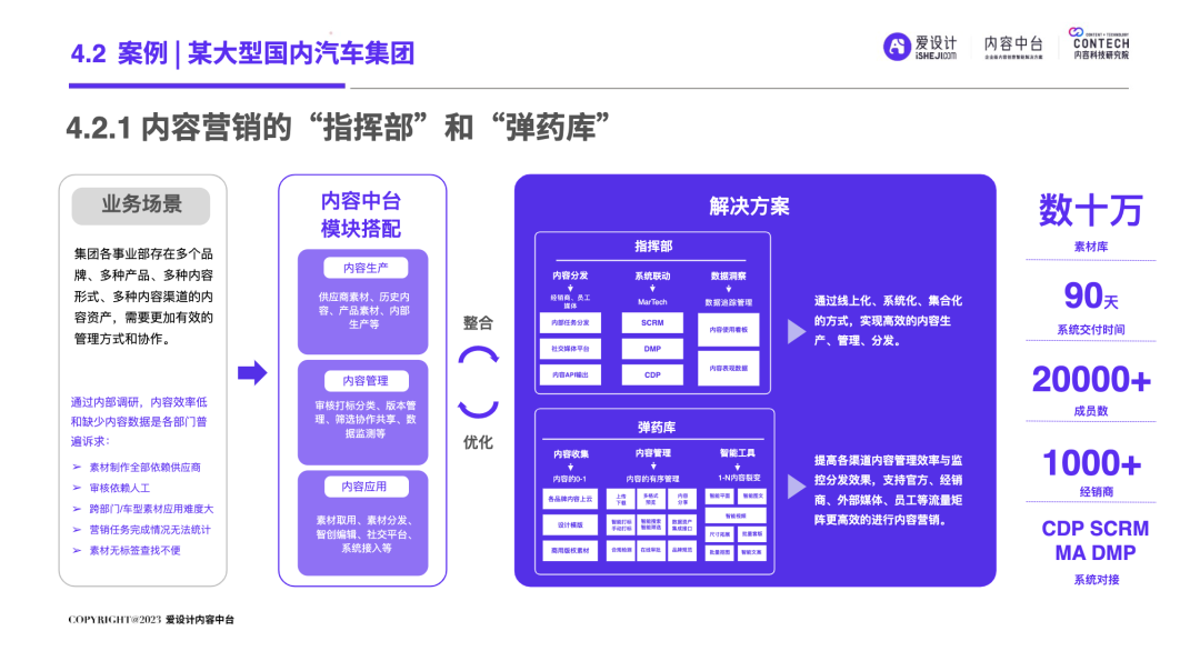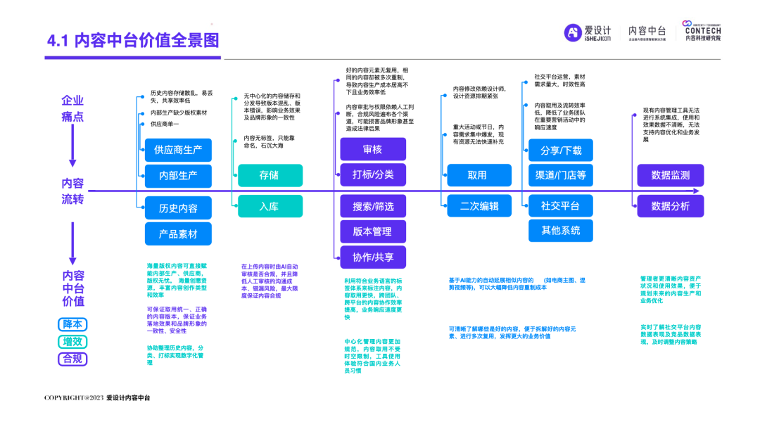 随着企业的不断发展,前台和后台的“轮速率匹配失衡”的问题逐步显现,后台很难及时响应前台进行创新——内容营销过程中所有相关的内容资料、内容数据和内容资产交织成一张庞大的、相互连接并相互转化的“内容互联网”,激活这张内容网,是盘活整个营销网的关键。内容中台区别于其他中台,它是基于企业内容池之中、实施企业内容战略过程中必须具备的一种核心思维和关键能力,构建内容中台,就是将内容池中的所有内容的进行价值连接、激活、放大和变现。继DataTech(数据中台)、MarTech(营销中台)和 AdTech(广告中台)之后,ConTech(内容中台)的诞生对营销、投放、增长和流量管理的生态版图进行了深刻改造,并取得了很好的效果。将企业内部的多个中台系统进行串联,在营销数字化的转型关键期,成为支持企业战略决策的有力武器,获得更加长远发展机会。内容中台的发展恰逢其时,在经济、政策、科技三大“靠山”的支撑下,内容营销行业可牢牢抓住数字技术发展主动权,把握新一轮科技革命和产业变革发展先机,大力进行内部营销基建的数字化建设。存量代替增量市场,存量转化竞争显得尤为重要,流量红利结束,意味着内容红利来袭,每一次品牌(素材)与消费者(流量)的互动都变得无比重要。总体来说,“降本增效”成为品牌在2023年新的主题,如何通过降低企业内部私域运营及内容流转成本成为重中之重。在营销革命的几个关键节点的分析中,我们看到了营销阶段的大体走向。大浪淘沙、去粗取精,经过时代的荡涤,企业营销一方面继续沿着科技化、信息化的航向行进;另一方面,企业回归了重新审视自己内部系统效率的时刻。营销 4.0 时代,以数据生态系统进行营销内容的整合,是实施数字化转型的先决条件。它能帮助营销人员开展预测性营销,评估每一次营销投入的潜在回报;能帮助营销人员提供个性化和情景化的营销,为消费者设计流畅的互动界面。这需要对内容的管理速度非常迅捷,才能对市场变化做出实时响应。内容在营销策略中的地位不仅仅是素材的分发,随着“内容宇宙”从内容获取、内容加工、内容分发、内容消费到运营分析的全链路构建完善,精细化、个性化营销已经成为企业共识。与更多的业务场景相融合,要求内容营销脱胎传统营销,拥抱数字化转型。内容中台专注“全生命周期”的内容资产管理,可帮助企业在内容方面更专注、更精准的回收、利用、分发、增长。报告中显示,内容中台在帮助企业在管理价值、组织提效、内容降本、驱动增长方面均有不同程度的提高。在一线优质内容帮助一线工作人员使用更丰富的营销物料的背后,是增加企业目标客户注意力留存的深层逻辑,更是数字技术进步、中台技术不断发展的内容资产管理的体现。是内容的协同、生产、管理、分发等一系列内容科技的良性循环。伴随着企业需求方逐渐增多,企业方对内容技术的有序、高效、数字化管理的需求更多样化起来。调研结果显示,企业主期待内容中台作为系统底座所解决的问题,主要集中在以下几个方面:组织内内容审批的协同高效、不同内容可实现层级预览、内容存储空间增大、上传下载运转效率提升等。以上企业主的认知增强,促使内容中台提升企业对接效率,推动着服务商对ConTech服务和产品体验的提升。企业需求方数字化转型的持续推进与对ConTech相关投入的加大,将带动我国ConTech服务商数量的逐渐增多和服务体系的完善。内容营销在企业营销活动中所占比重越来越大,因其数字化程度逐渐增高而随之产生并应用的数据也越来越庞大—这些数据在业务过程中直接驱动下一步的营销活动。传统调研已经被排斥在这个流程之外,而数据中台所形成的数据对于营销来说欠缺精准。根据爱设计内容中台的调研结果显示,78%的企业主认为指导自身营销战略的数据比较少;62%的企业主认为市场趋势难以把握;而更多企业主认为自己的营销策略稍有延迟。缺乏战略指导的首要原因,是内容投放的数据沉淀折损。企业主的每一步投放都需要有非常细分的人群画像、投放渠道、内容分类等数据回流。内容中台对于内容洞察的支持,首先体现在用技术系统将关键的内容数据筛选出来,之后在内容生产流程中,建立优质内容解析机制,最终完成溯源到内容生产流程的第一线。这一整套流程是基于ConTech的服务体系建立的。虽然互联网的流量趋于见顶,但各企业主对于流量的竞争依旧激烈,行业对广告内容的数量和质量都提出更高要求。目前,在内容和创意场景下,企业主对于营销赋能平台的诉求主要通过创意模板、程序化创意平台、创意及内容交易平台等三种模式为企业需求方提供差异化的内容和创意服务。其中,1)企业内容服务商多以月度或年度服务费形式合作;2)智创模板类适用于个人或小企业主,主要商业模式包括软件订阅费和单次付费等;3)定制设计则主要通过撮合交易赚取服务费。内容中台的定制化技术,可支持三种模式的自由配置和调用,不通过企业的规模粗暴定义中台配置,可更快更好地为营销赋能。在调研问卷中取均值显示,500人规模的企业设计人员在3-10人左右,大规模的企业如千人以上规模,设计人员大多在20-30人以内,更多选择以外部服务商的形式多点合作,看似节省了企业内部的人力,但增加的不仅是内容成本,更是沟通成本。内容中