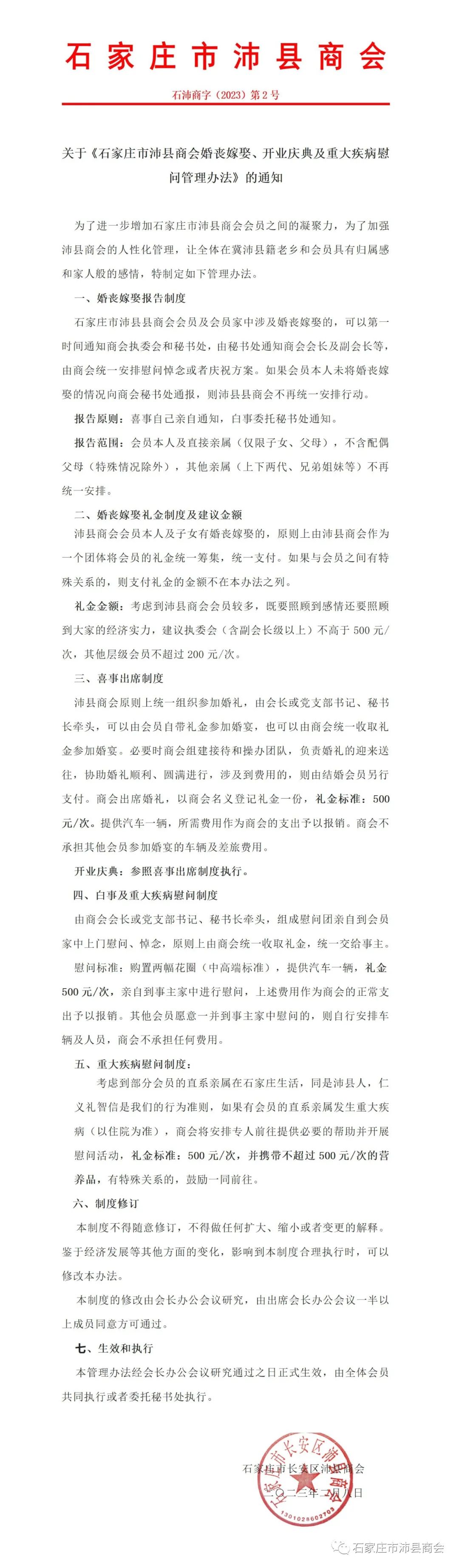 沛县商会会员本人及子女有婚丧嫁娶的,原则上由沛县商会作为一个团体将会员的礼金统一筹集,统一支付。如果与会员之间有特殊关系的,则支付礼金的金额不在本办法之列。