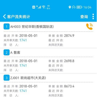 管家婆辉煌版、物联通,电脑、手机端上都有客户流失预警,可以查询客户多久没有下单,最后下单的时间以及金额,方便跟进客户,不让客户流失。