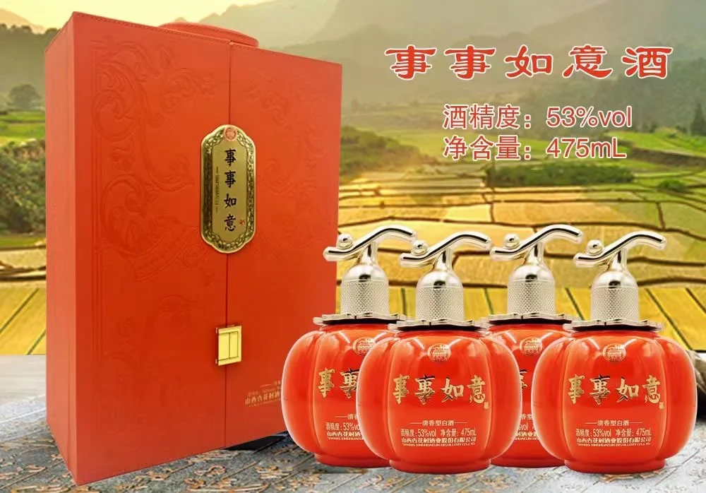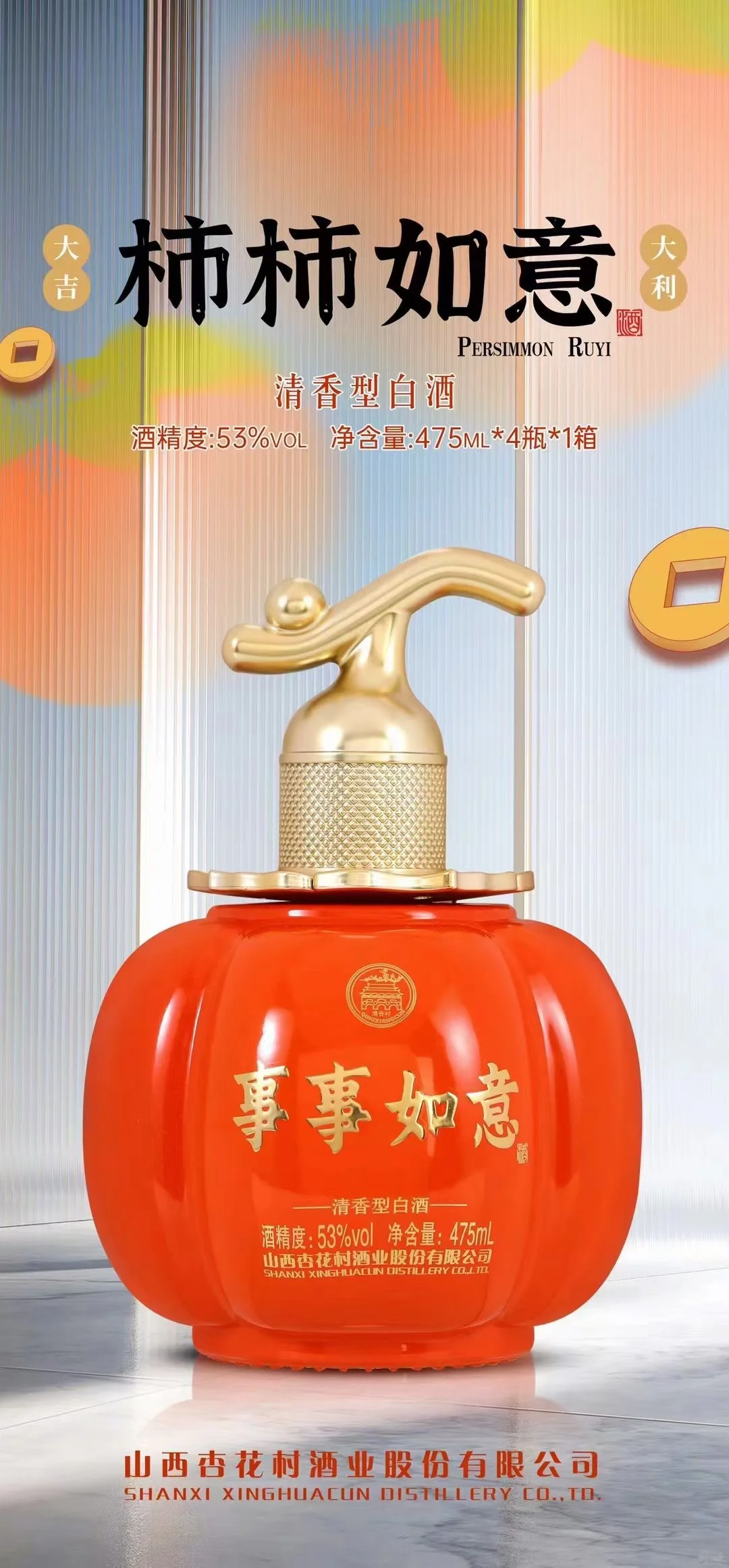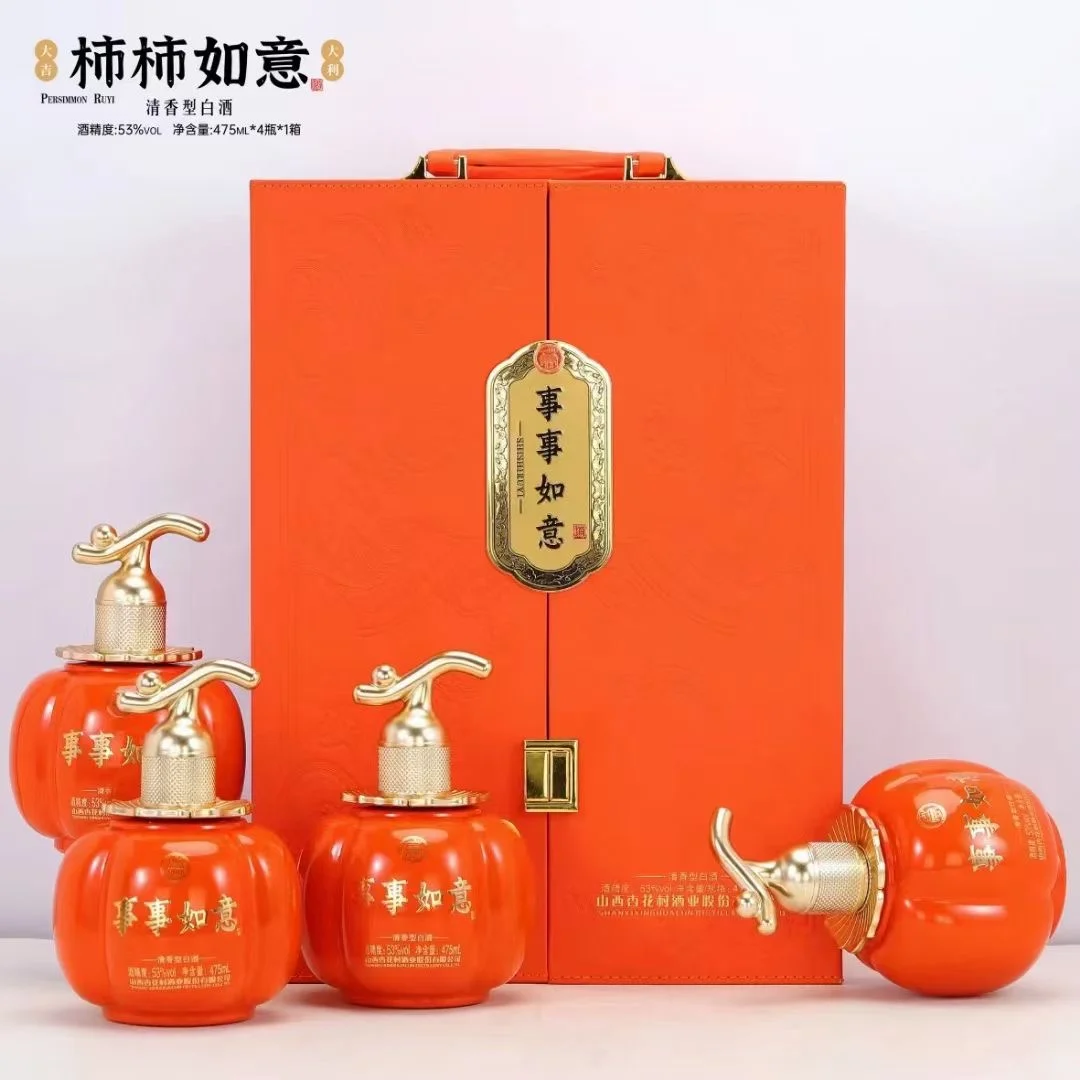 这种以柿子造型且名为“事事如意”的汾酒很有创意。从外观上看,柿子造型的酒瓶独特新颖,具有很强的辨识度和美感。