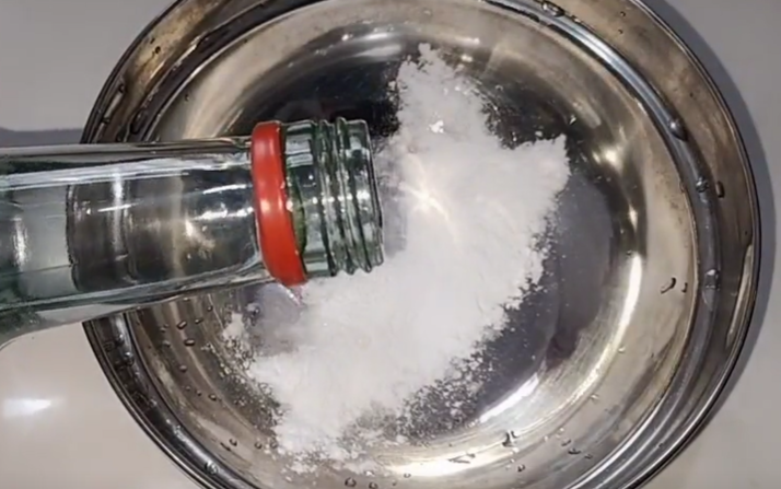 首先准备一个小碗,在小碗里边倒入小苏打,大约两勺的小苏打就可以了。再准备一瓶白酒,把盖子拧开,然后把白酒倒进小苏打里边,没过小苏打,准备一个棉棒或者是勺子,把小苏打和白酒搅拌均匀。