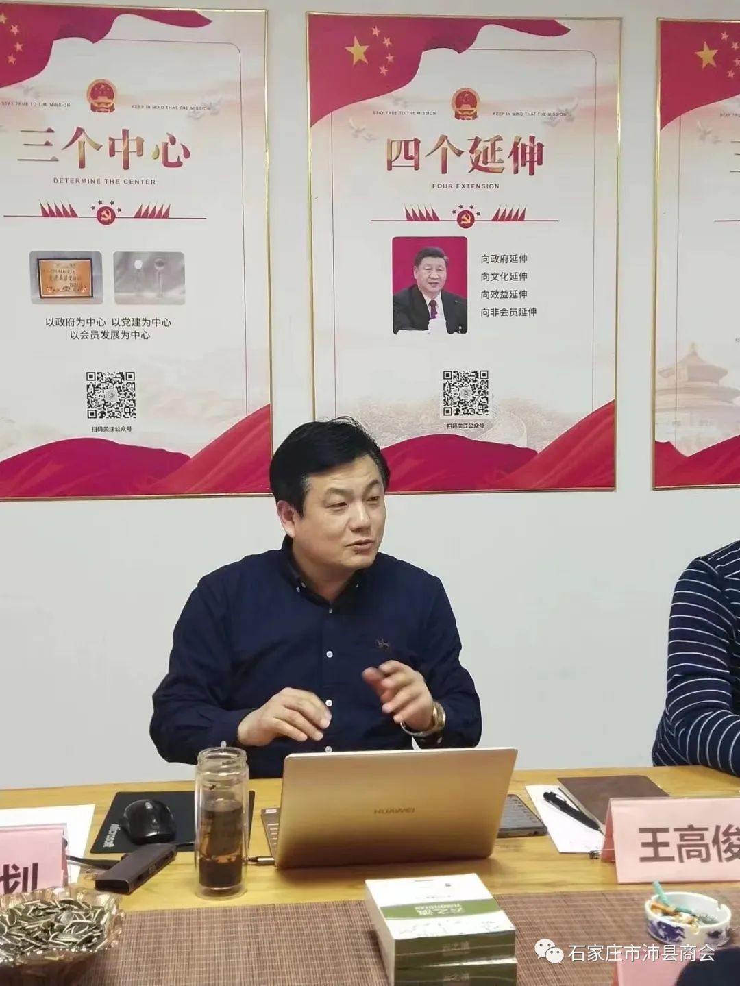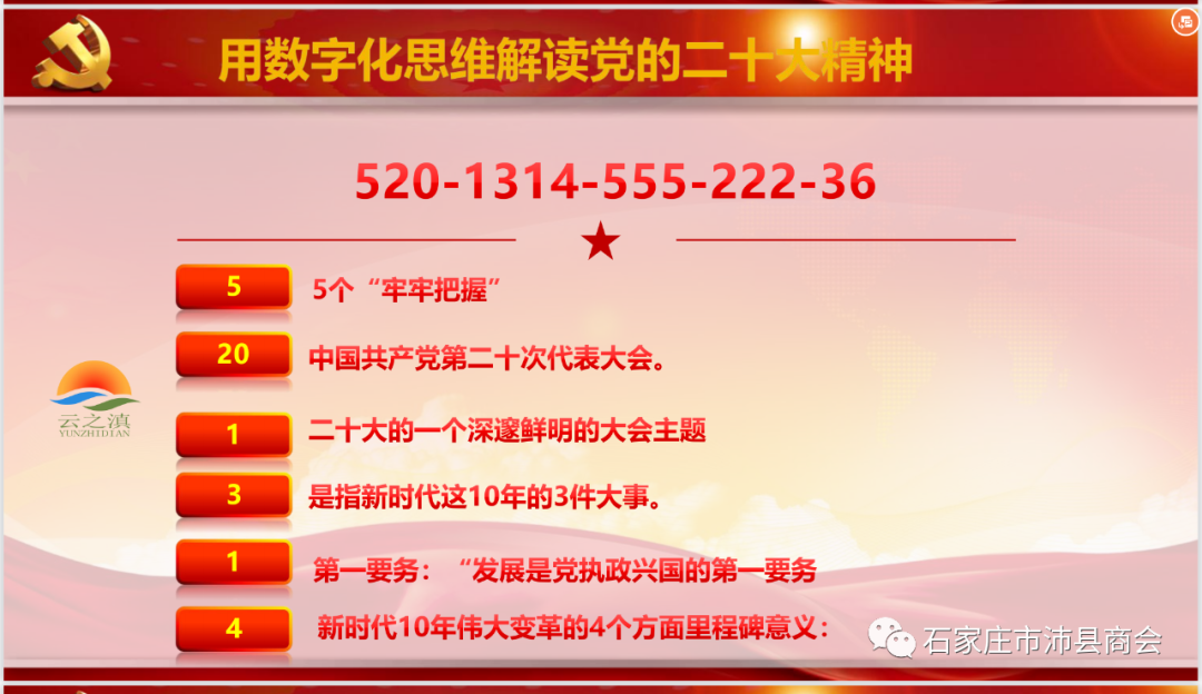会议开始,石家庄市委组织部两新组织二十大精神宣讲团成员、石家庄市沛县商会会长王高俊以《数字化思维解读二十大精神》为主题(商会微信公众号查询),用“520-1314-555-222-36”一串数字把二十大精神的核心内容、重点内容、关键内容解释的非常透彻,并对中央经济工作会议、中央农村工作会议的相关内容进行了解读,以生动的案例结合石家庄市沛县商会会员工作实际,让大家切身体会到党的关怀,坚定信心听党话、跟党走。