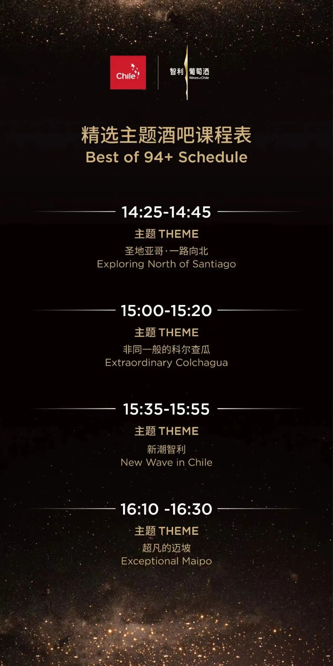 94+·臻耀·智境将于3月7日、3月9日首次登陆上海和广州。这是智利葡萄酒协会一年一度的巅峰盛会,集结了几乎所有的智利名庄和高端产品。94+盛会将为行业和消费者展示智利葡萄酒最优秀的一面,同时也为行业提供新的商业机会。今年的94+活动将由大师班、品鉴会与94+精选酒吧三个环节组成。