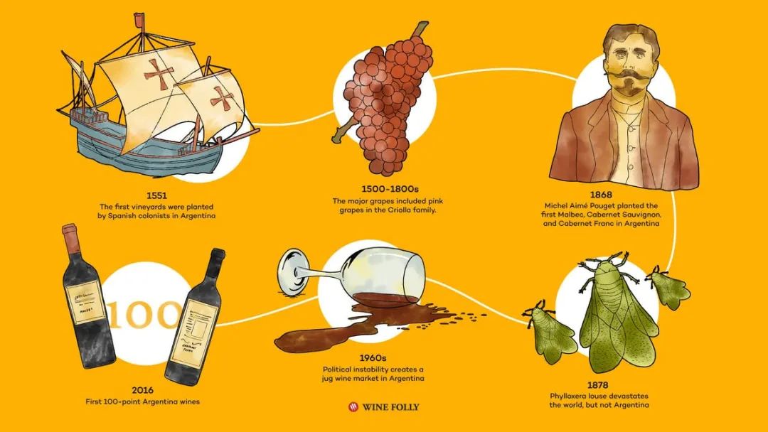 将阿根廷的历史与葡萄酒发展史联系起来是很有必要的,从中我们可以发现一些重大事件是如何帮助或阻碍阿根廷葡萄酒向世界传播的。特别是阿根廷如何在30年的时间里实现自我转型,成为顶级生产国,这个话题尤其值得探索。