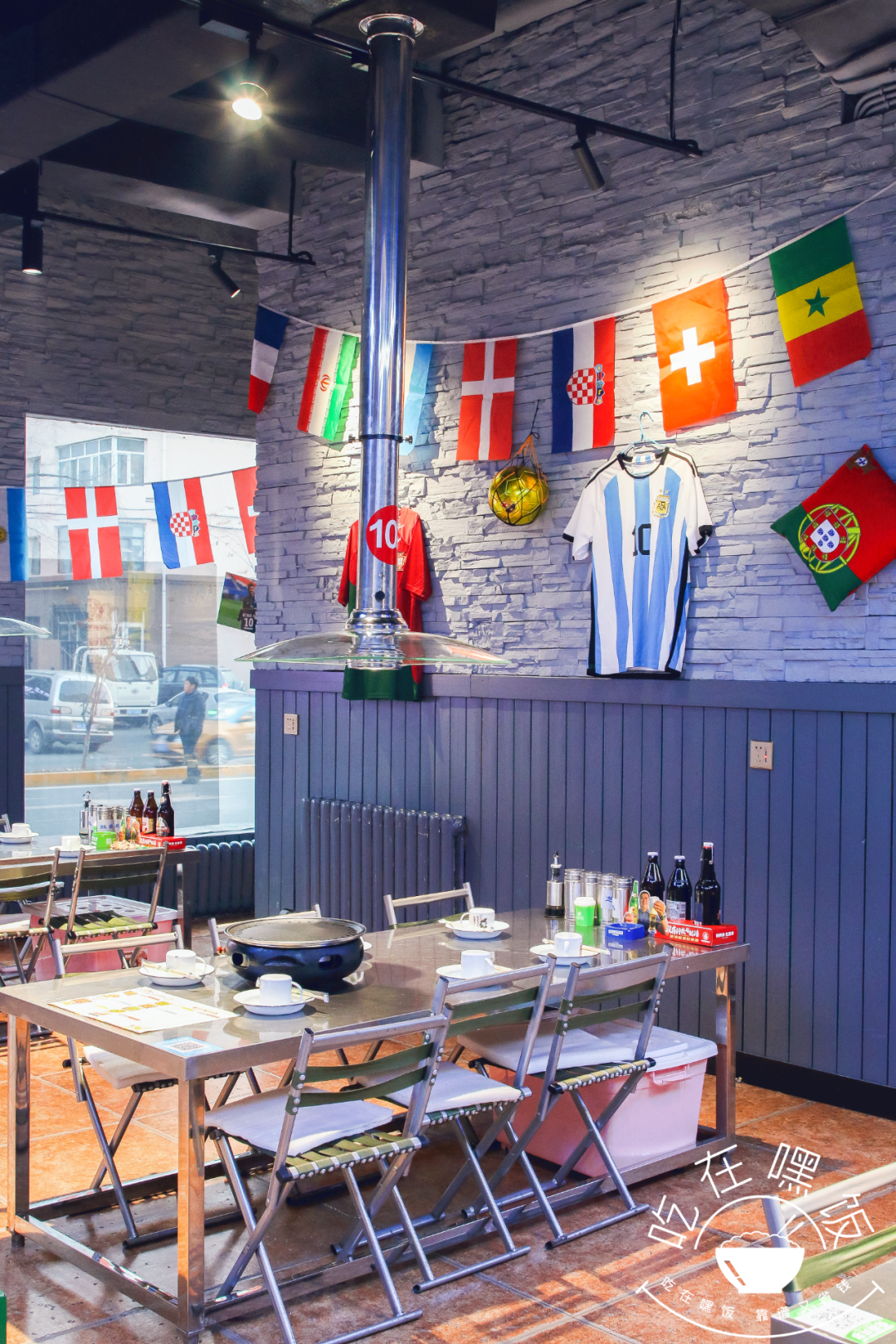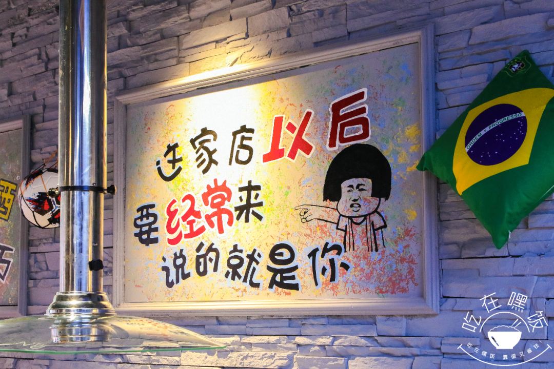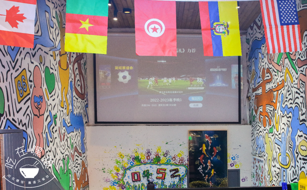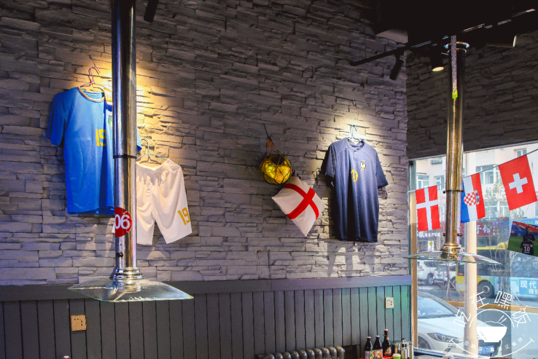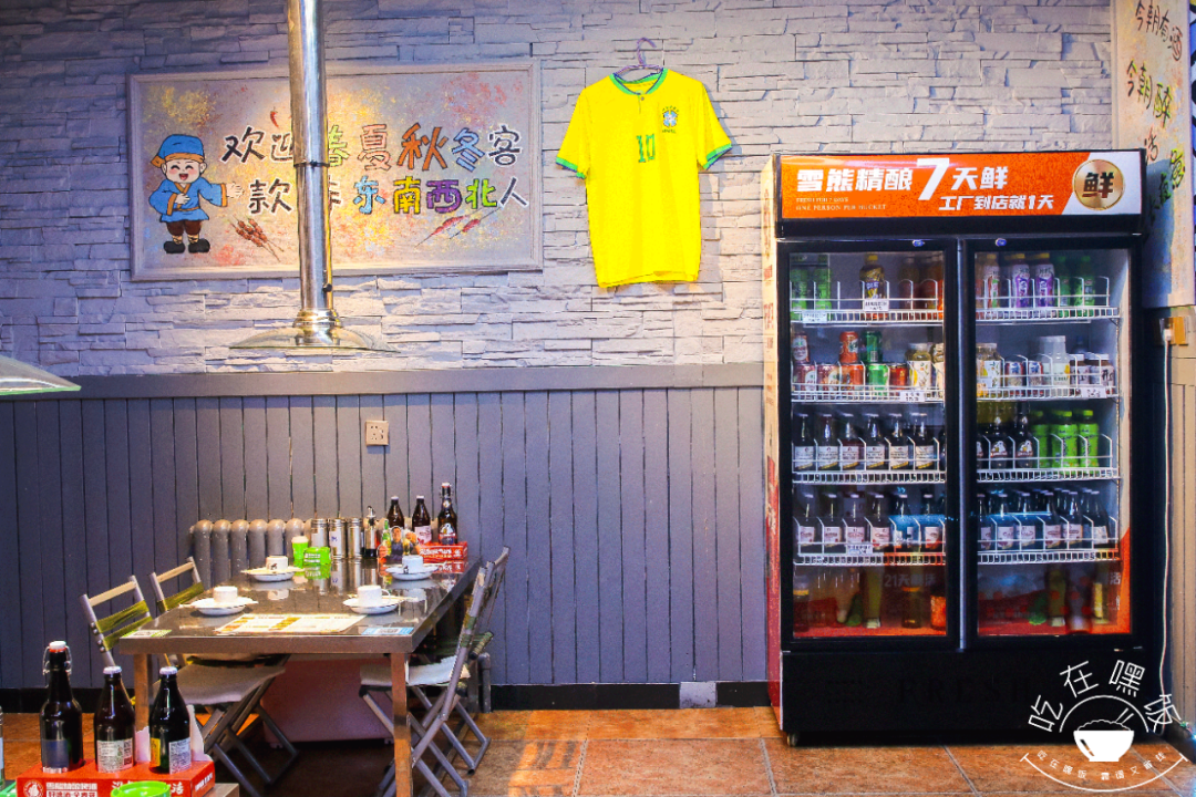 就是这家0452地摊烤串!一进店就是满满足球的氛围,如果你是铁杆球迷,来这看球保证你嗨到天亮都不想走!墙上挂满了世界杯元素的装饰,球衣、足球、抱枕,还有各国的国旗,光是身在其中就已经热血满满,可想在这坐着边撸串喝酒边看球赛的精彩盛况了!墙上到处都是涂鸦,坐在店里仿佛坐在喧闹的街边,就算天再冷也能在店里感受到市井气,目光所及,每一处都充满人间烟火的气味。老板一定是个铁杆球迷。超大的屏幕循环播放球赛,满满足球元素,男朋友来这就不想走!展柜里摆放了超多品种的酒水,不怕你喝的多,就怕你喝不完!(饮酒需适量,未成年人不得饮酒)小马扎一坐,小烧烤一撸,小啤酒一喝,感觉瞬间到位,在这吃饭也太得劲儿了!