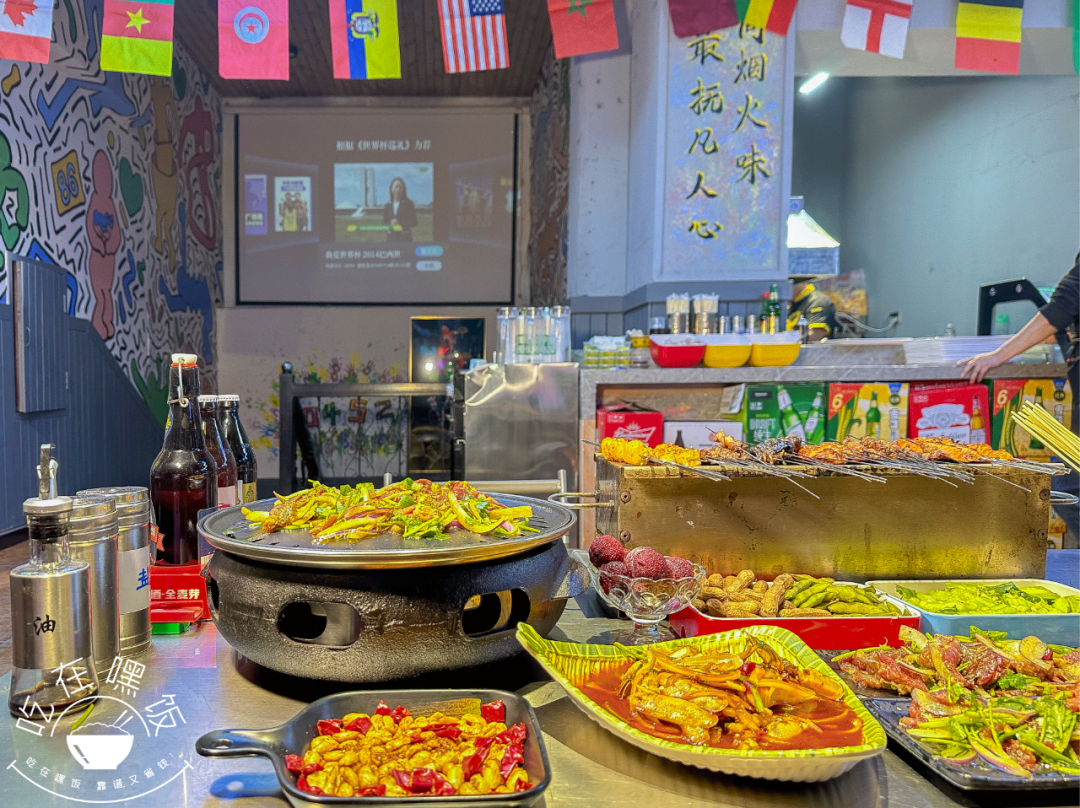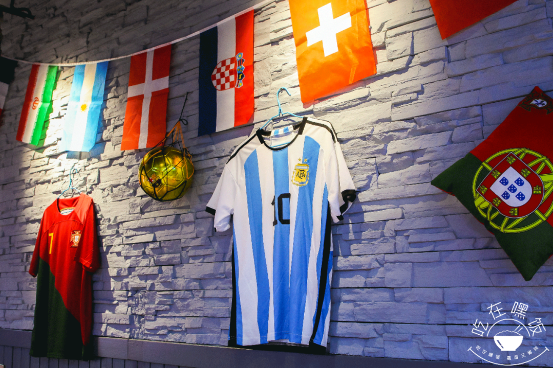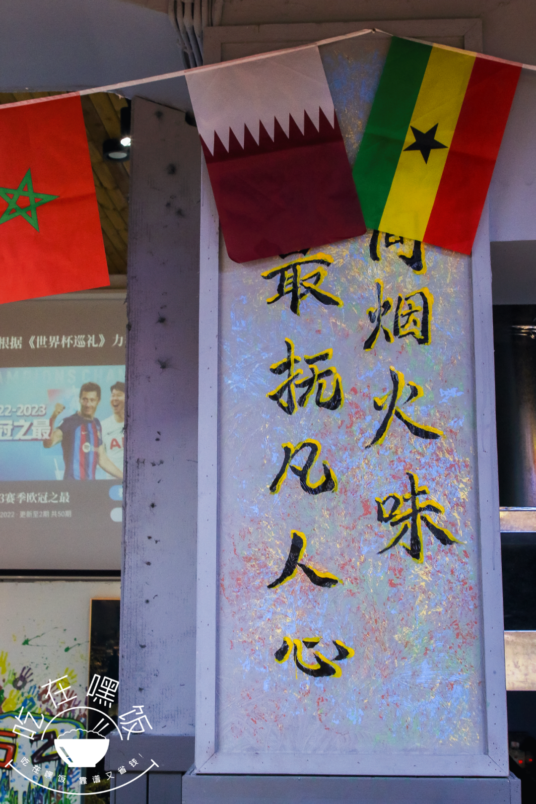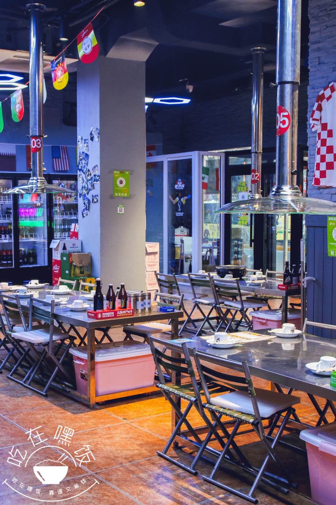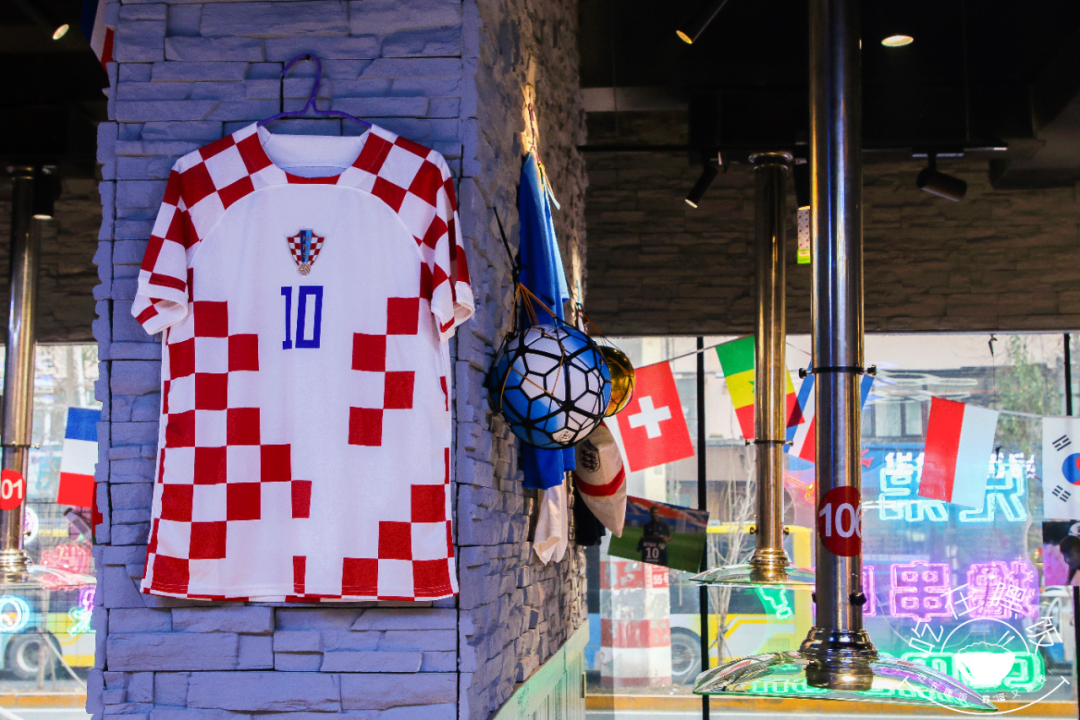 就是这家0452地摊烤串!一进店就是满满足球的氛围,如果你是铁杆球迷,来这看球保证你嗨到天亮都不想走!墙上挂满了世界杯元素的装饰,球衣、足球、抱枕,还有各国的国旗,光是身在其中就已经热血满满,可想在这坐着边撸串喝酒边看球赛的精彩盛况了!墙上到处都是涂鸦,坐在店里仿佛坐在喧闹的街边,就算天再冷也能在店里感受到市井气,目光所及,每一处都充满人间烟火的气味。老板一定是个铁杆球迷。超大的屏幕循环播放球赛,满满足球元素,男朋友来这就不想走!展柜里摆放了超多品种的酒水,不怕你喝的多,就怕你喝不完!(饮酒需适量,未成年人不得饮酒)小马扎一坐,小烧烤一撸,小啤酒一喝,感觉瞬间到位,在这吃饭也太得劲儿了!
