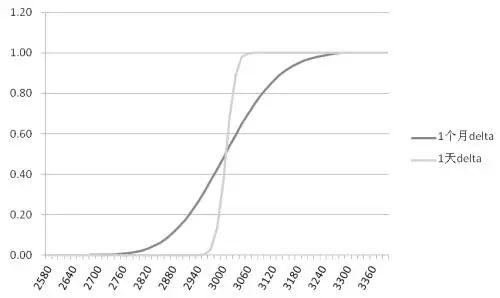 示例:以大商所拟推出的豆粕期权为例,对于执行价格为3000元/吨的豆粕期权来说,一天后到期和一个月后到期的看涨期权delta变化如下图所示: