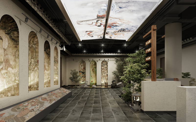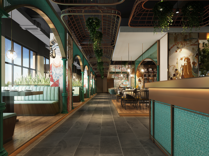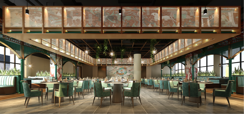 敦煌夜市,也称为沙州夜市,位于阳关东路,是敦煌最大的夜市,这里是丝路美食和和丝路工艺品的聚集地,因为具有鲜明的地方特色和浓郁的民俗风情,被誉为敦煌“夜景图”和“风情画”。为核心在设计中引入"绿色设计”的理念,诣在为空间的使用者 ,营造一个轻松氛围。从天然绿色环保的环境入手,强调良好的室内环境品质和 。自然生态化。突出环境特色,创造自然共生的就餐环境,营造出人与自然和谐 ,共处,天人合一绿色环境。由古至今,从视觉——“元素融入”、味觉——“传统饮食”、听觉——“以敦煌传统乐曲”为空间背景音乐,一体——“特色服务”三位一体入手,打造沉浸式体验,追溯敦煌古代繁荣的同时,向世人展示当代繁荣敦煌的魅力。从以上两方面提炼当地专属文化元素符号,以软装形式,VR投影、新型材料等融入空间以三层空间为主,打造博物馆式的视觉体验。