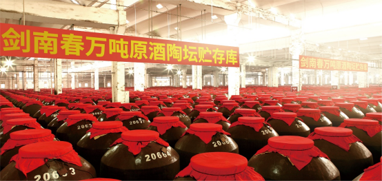 贮藏是白酒传统工艺中一道重要的工序,剑南春酒采用中国白酒老熟的最佳存贮容器―陶坛。经年储存的白酒在陶坛中成熟蜕变,滋味随贮存时间的增加更加突出,滋味更加悠美、绵柔。