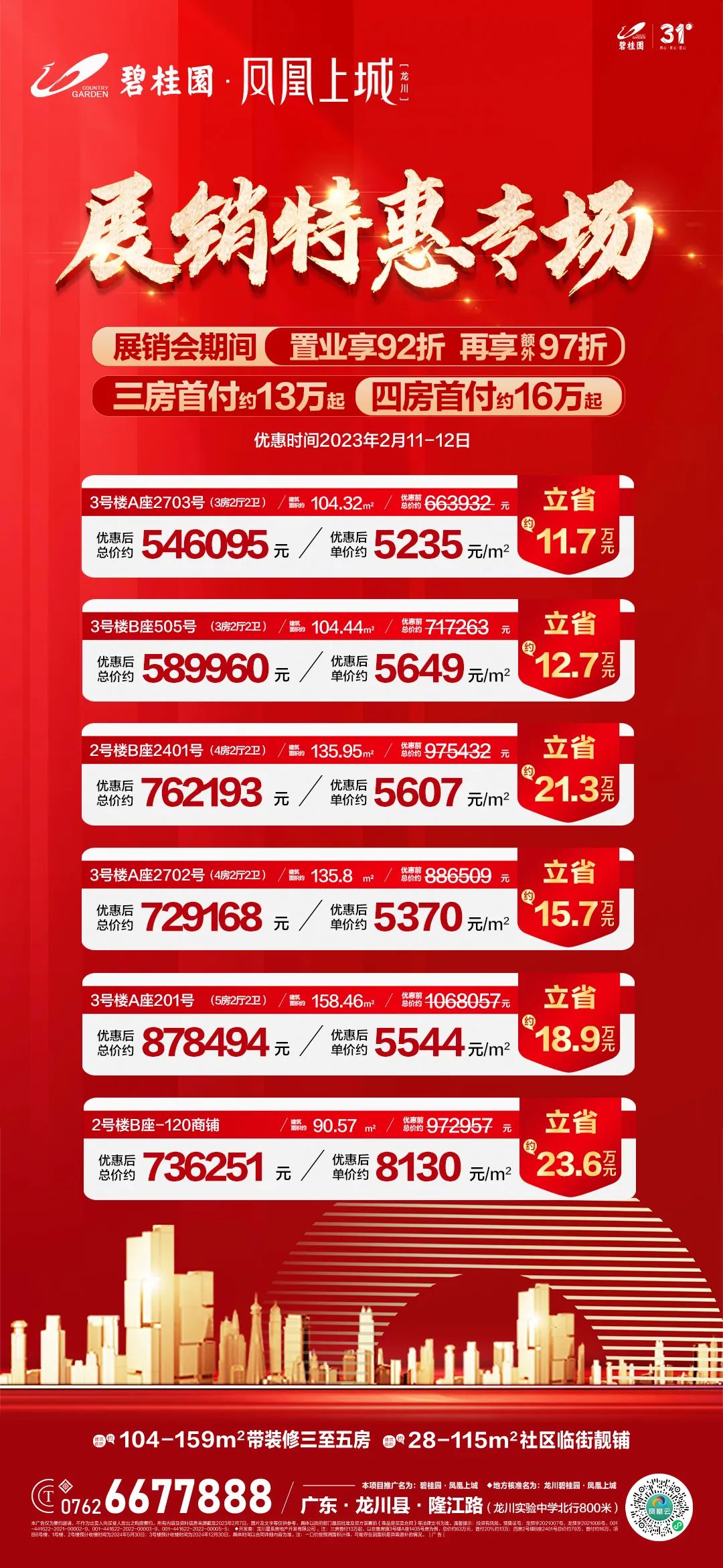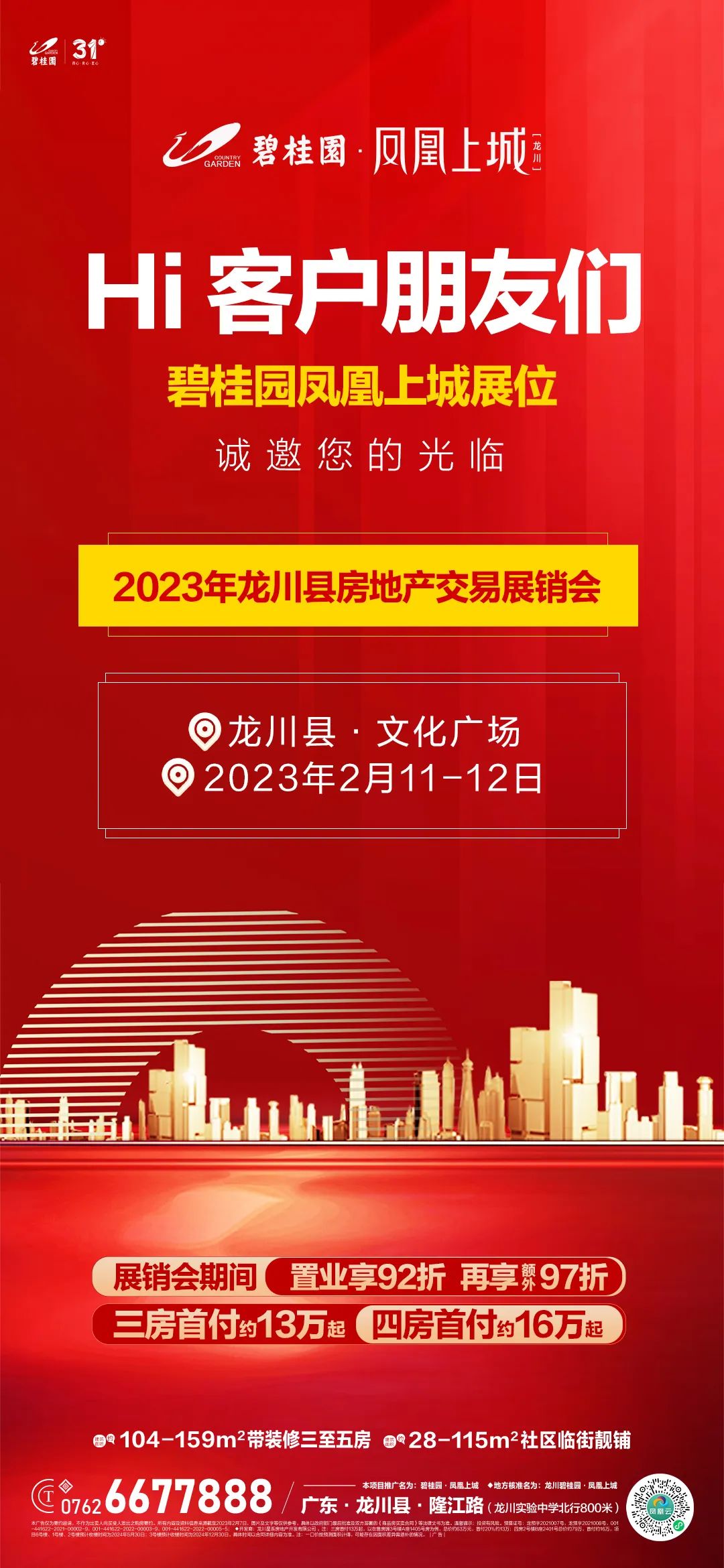 为深入贯彻落实国家及省市有关房地产市场决策部署,提振市场信心、激发市场活力、助力住房消费。由龙川县人民政府主办、龙川县住房和城乡建设局承办的主题为“锦绣龙川平安居 房企让利惠全城”房地产交易展销会于2023年2月11-12日在龙川县文化广场顺利举办。碧桂园凤凰上城展位,诚邀您的光临!