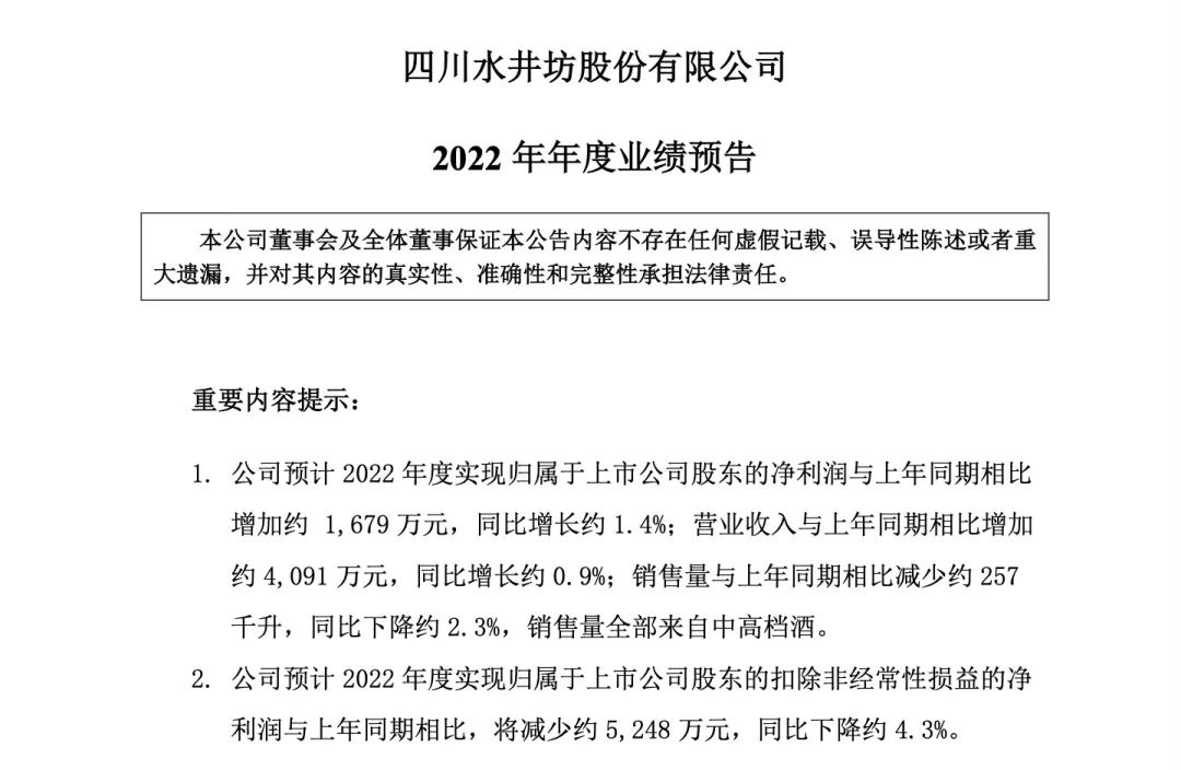 水井坊也实现了营收与利润的同步增长,但增幅相对较小。2022年水井坊营收预计比上年增加约4091万元,同比增长约0.9%;净利比上年同期增加1679万元,同比增长1.4%。不过,其扣非净利润出现了下降,与上年同期相比减少约5248万元,同比下降4.3%。水井坊给出的解释是:受疫情影响,消费需求与场景严重萎缩,渠道库存压力大,市场缩量竞争。