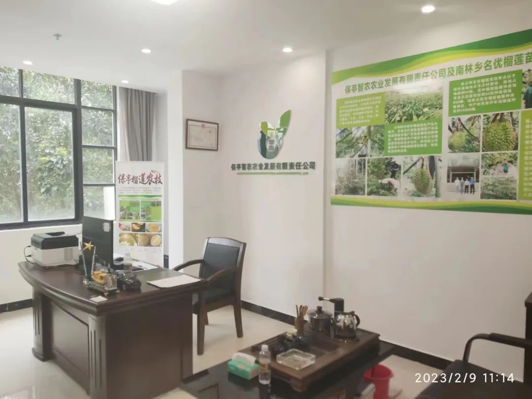 保亭智农农业发展有限责任公司注册于2020年6月,致力于推广保亭智慧农业发展的新型理念模式,主营业务范围:农作物种子经营、技术服务、开发、交流、转让、推广等农业专业辅助性活动,公司拥有名优榴莲苗培育点,位于保亭县南林乡东方村委会,已培育出适合保亭本地种植的优质榴莲种苗。为了保证保亭榴莲产业栽培技术的稳定性,解决榴莲种植户种植技术疑难问题,保亭智农农业发展有限责任公司与中国热带农业科学院海口实验站优稀水果品种选育与高效栽培课题组进行技术合作,并聘请专家团队担任技术顾问,定期为公司种植户提供榴莲高效栽培技术培训。