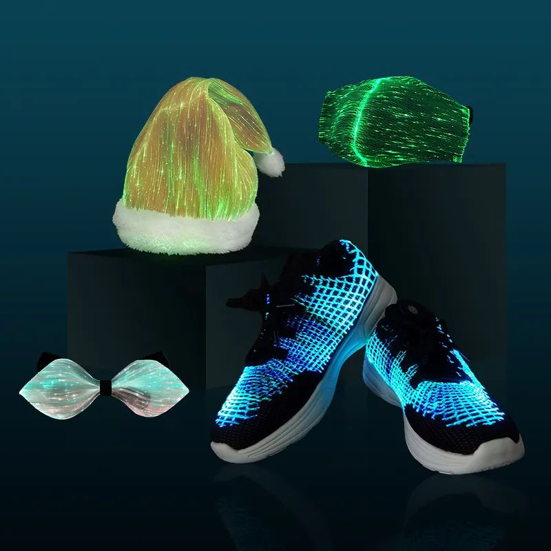 光纤发光配饰包含:发光口罩、领结、帽子、胸罩、宠物背心、包包、鞋子等。