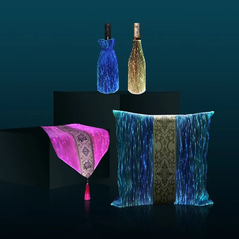 光纤发光家居包含:发光抱枕、酒瓶套、桌布、窗帘等。