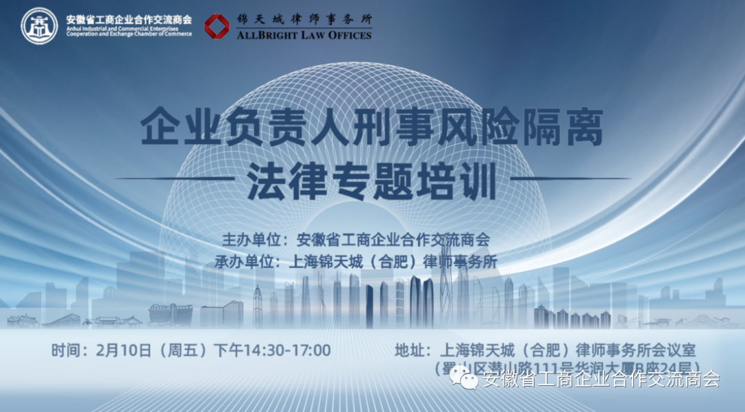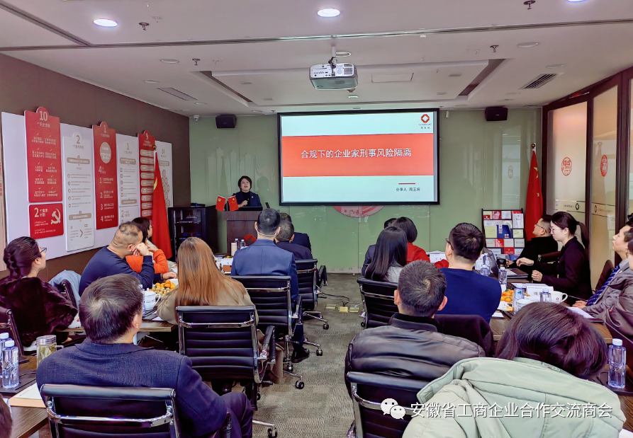 为进一步打造法治化营商环境,促进民营经济健康发展,提升企业家风险防范意识,2月10日下午,商会主办的《合规下的企业家刑事风险隔离》的法律知识讲座在华润大厦B座上海锦天城(合肥)律师事务所会议室举办。