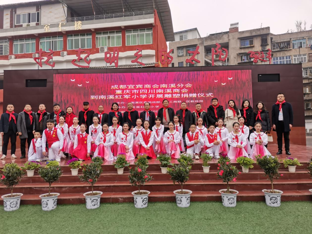 2月10日,值此南溪红军小学(原前进校)建校110周年、2023年新春开学之际,成都宜宾商会南溪分会、重庆市四川南溪商会(后简称:成渝南溪商会)捐赠“小红军”雕塑仪式在该校隆重举行。