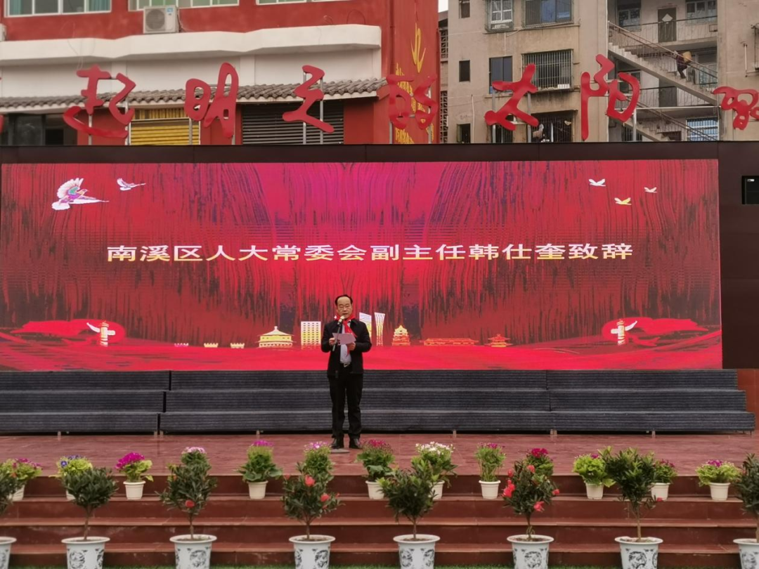 区人大常委会副主任韩仕奎出席捐赠仪式并讲话。韩仕奎受区委书记刘刚同志委托,首先代表区四家班子和42万家乡人民,衷心感谢成渝南溪商会企业家们多年来对南溪的关心支持,指出此次捐赠“小红军”雕塑是企业家们用实际行动支持家乡经济社会建设、支持红色教育发展的爱心之举;给红军小学同学们一份厚重的礼物,丰富红军小学工农红军革命史教育载体。韩仕奎要求,红军小学师生们不负商会企业家们的厚爱,运用好红色资源,弘扬好革命文化,传承好红色基因,让信仰之火熊熊不熄。