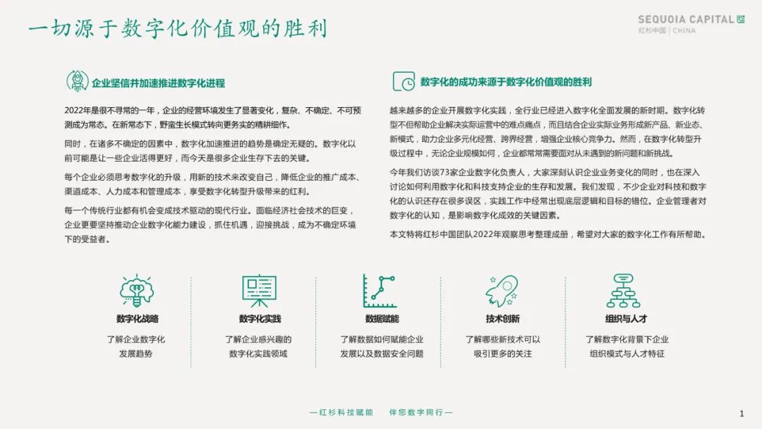 2022年是很不寻常的一年,企业的经营环境发生了显著变化,复杂、不确定、不可预测成为常态。在新常态下,野蛮生长模式转向更务实的精耕细作。同时,在诸多不确定的因素中,数字化加速推进的趋势是确定无疑的。数字化以前可能是让一些企业活得更好,而今天是很多企业生存下去的关键。每个企业必须思考数字化的升级,用新的技术来改变自己,降低企业的推广成本、渠道成本、人力成本和管理成本,享受数字化转型升级带来的红利。每一个传统行业都有机会变成技术驱动的现代行业。面临经济社会技术的巨变,企业更要坚持推动企业数字化能力建设,抓住机遇,迎接挑战,成为不确定环境下的受益者。越来越多的企业开展数字化实践,全行业已经进入数字化全面发展的新时期。数字化转型不但帮助企业解决实际运营中的难点痛点,而且结合企业实际业务形成新产品、新业态、新模式,助力企业多元化经营、跨界经营,增强企业核心竞争力。然而,在数字化转型升级过程中,无论企业规模如何,企业都常常需要面对从未遇到的新问题和新挑战。今年我们访谈73家企业数字化负责人,大家深刻认识企业业务变化的同时,也在深入讨论如何利用数字化和科技支持企业的生存和发展。我们发现,不少企业对科技和数字化的认识还存在很多误区,实践工作中经常出现底层逻辑和目标的错位。企业管理者对数字化的认知,是影响数字化成效的关键因素。不确定环境下的数字化认知