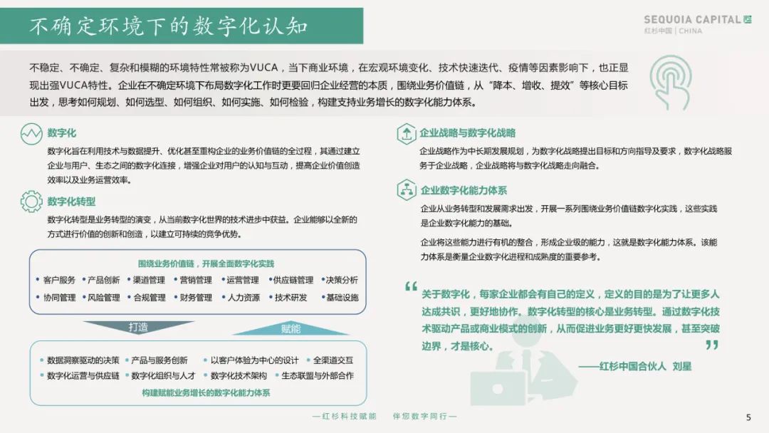 不稳定,不确定,复杂和模糊的环境特性常被称为VUCA,当下商业环境,在宏观环境变化、技术快速迭代,疫情等因素影响下,也正显现出强VUCA特性,企业在不确定环境下布局数字化工作时更要回归企业经营的木质,围绕业务价值链,从“降木、增收,提效”等核心目标出发,思考如何规划,如何选型,如何组织,如何实施,如何检验,构建支持业务增长的数字化能力体系。