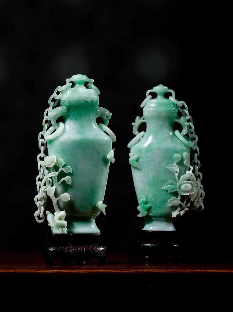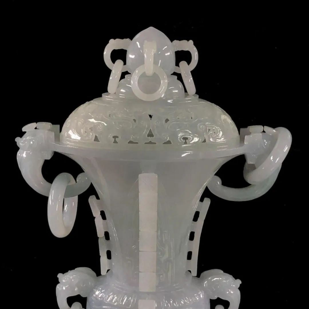 链条工艺,于炉、瓶、塔、熏、片、锁、坠等玉雕物件上都有出现,在瓶炉等中大型器皿中出现得尤为广泛,也最具代表性。环链常见于玉器器皿,其他作品中也有应用。在整块玉石上取出环键要通过对造型的整体研究和玉石性质的研究后才能确定方案。环链的位置、取法、大小、长短都与玉石性质和作品的整体造型紧相关联,例如脆性材料不易把环链作的太细,韧性材料可以取出秀丽的环链。