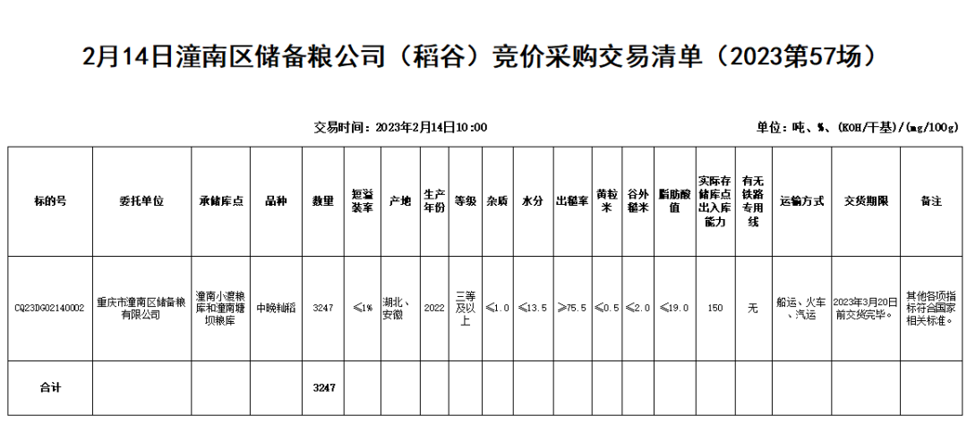 2月14日潼南区储备粮公司(稻谷)竞价采购交易会公告(2023第57场)