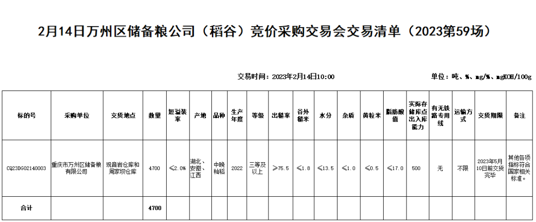 2月14日万州区储备粮公司(稻谷)竞价采购交易会公告(2023第59场)