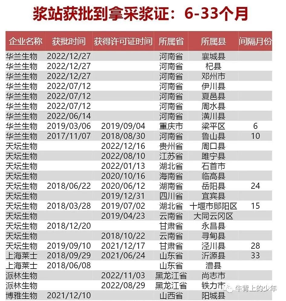 这个行业的投资新获批的浆站固然重要,但真正重要的还在后边。从获批到真正的拿到开工证的时间跨度巨大。浆站获批到拿采浆证:6-33个月
