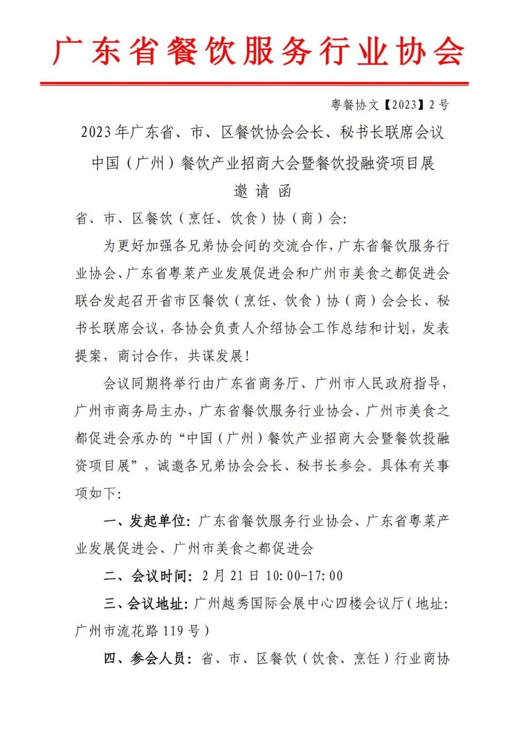 【行业活动】省、市、区餐饮协会会长、秘书长联席会议邀请函