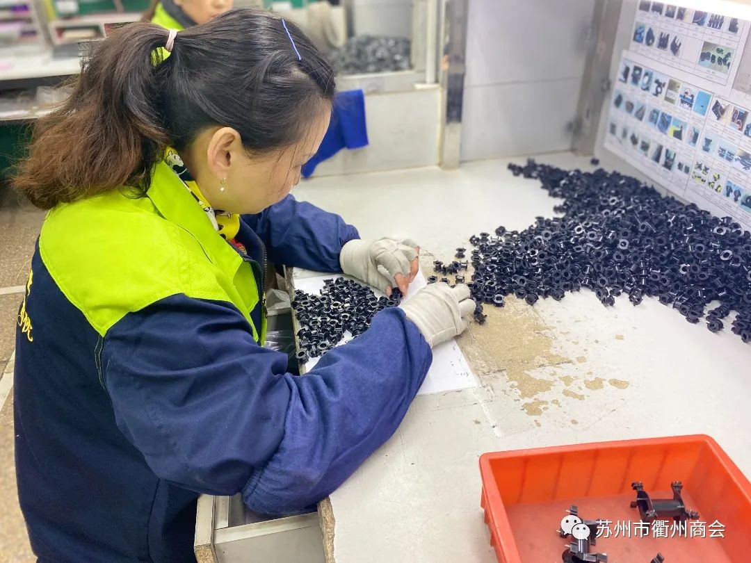 公司负责人严双双对商会一行到公司的后方表示热烈的欢迎,简短的座谈交流后他带领大家对生产车间进行了参观,并作了简单的介绍,我们通过介绍了解到整个生产的流程为塑胶射出成型后进行毛边处理、再插PIN、品管检测后再包装入库出货。