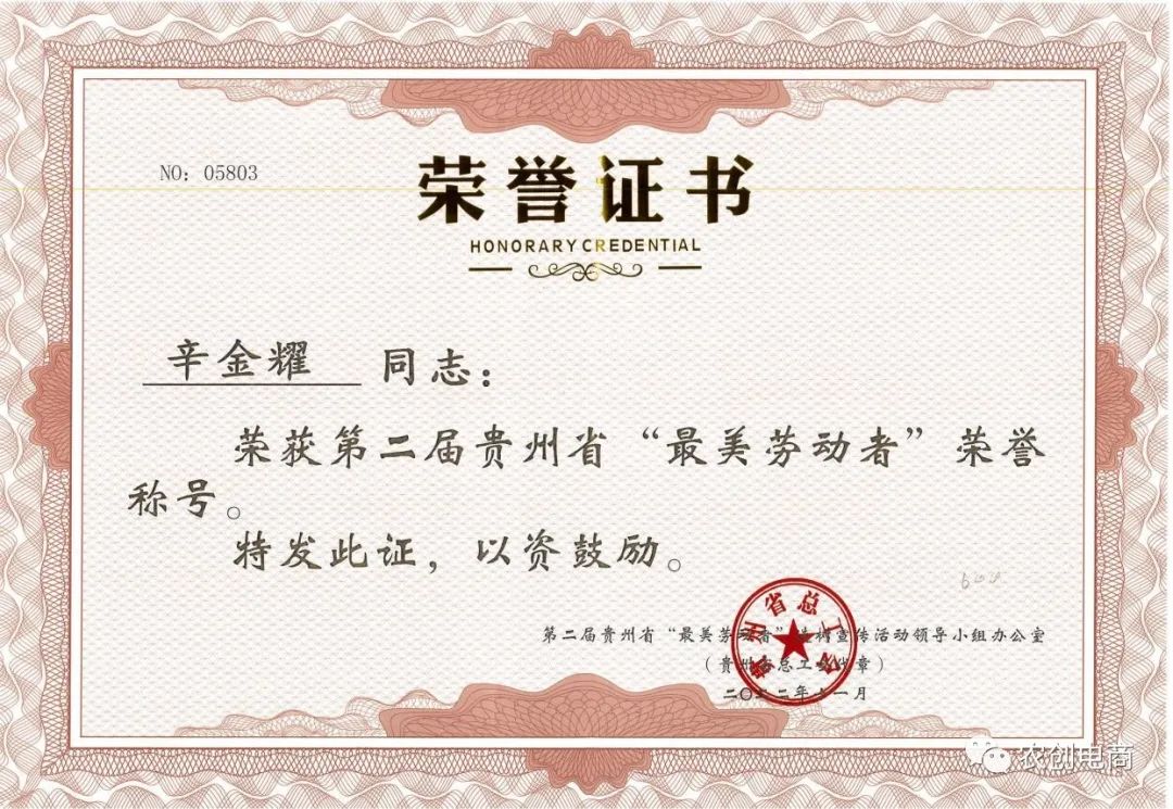 喜报!织金农创电子商务有限公司辛金耀同志荣获“最美劳动者”荣誉称号