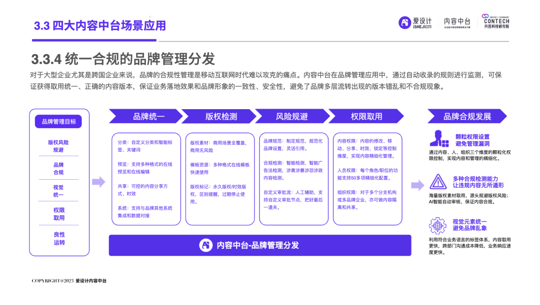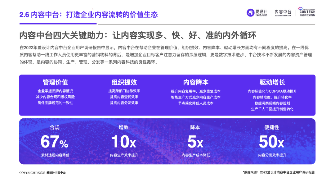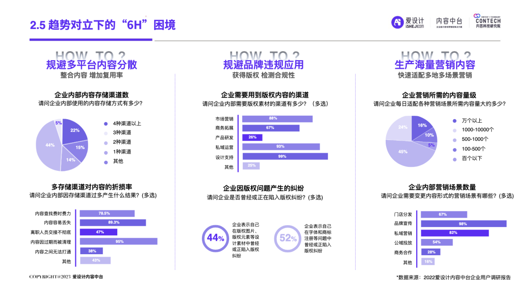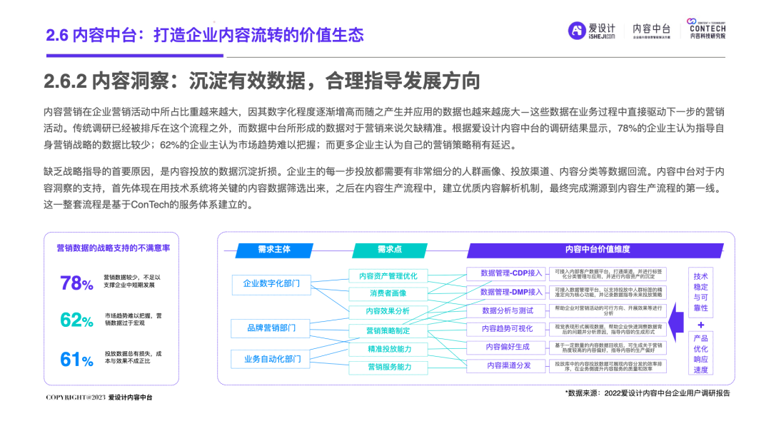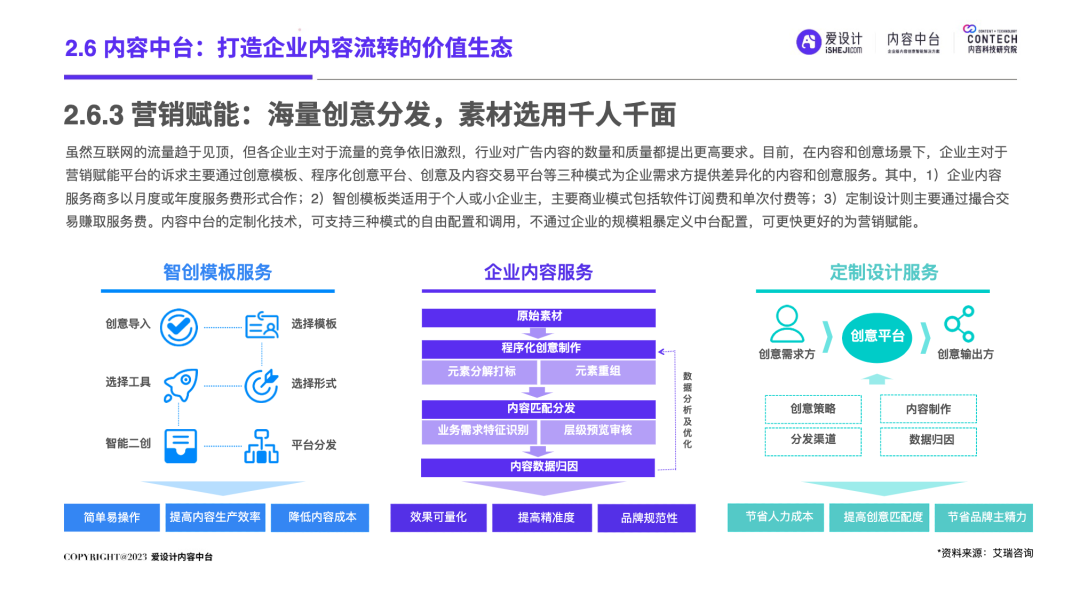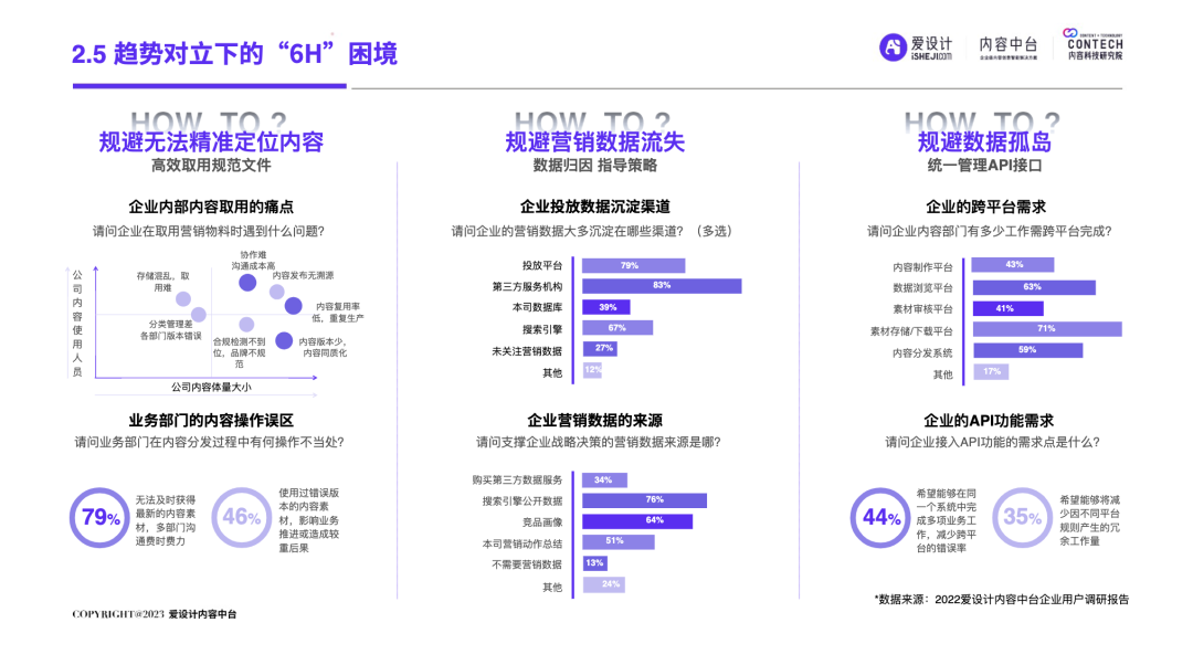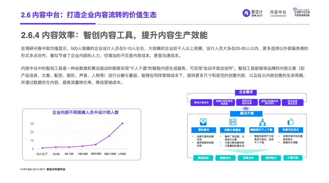 随着企业的不断发展,前台和后台的“轮速率匹配失衡”的问题逐步显现,后台很难及时响应前台进行创新——内容营销过程中所有相关的内容资料、内容数据和内容资产交织成一张庞大的、相互连接并相互转化的“内容互联网”,激活这张内容网,是盘活整个营销网的关键。内容中台区别于其他中台,它是基于企业内容池之中、实施企业内容战略过程中必须具备的一种核心思维和关键能力,构建内容中台,就是将内容池中的所有内容的进行价值连接、激活、放大和变现。继DataTech(数据中台)、MarTech(营销中台)和 AdTech(广告中台)之后,ConTech(内容中台)的诞生对营销、投放、增长和流量管理的生态版图进行了深刻改造,并取得了很好的效果。将企业内部的多个中台系统进行串联,在营销数字化的转型关键期,成为支持企业战略决策的有力武器,获得更加长远发展机会。内容中台的发展恰逢其时,在经济、政策、科技三大“靠山”的支撑下,内容营销行业可牢牢抓住数字技术发展主动权,把握新一轮科技革命和产业变革发展先机,大力进行内部营销基建的数字化建设。存量代替增量市场,存量转化竞争显得尤为重要,流量红利结束,意味着内容红利来袭,每一次品牌(素材)与消费者(流量)的互动都变得无比重要。总体来说,“降本增效”成为品牌在2023年新的主题,如何通过降低企业内部私域运营及内容流转成本成为重中之重。在营销革命的几个关键节点的分析中,我们看到了营销阶段的大体走向。大浪淘沙、去粗取精,经过时代的荡涤,企业营销一方面继续沿着科技化、信息化的航向行进;另一方面,企业回归了重新审视自己内部系统效率的时刻。营销 4.0 时代,以数据生态系统进行营销内容的整合,是实施数字化转型的先决条件。它能帮助营销人员开展预测性营销,评估每一次营销投入的潜在回报;能帮助营销人员提供个性化和情景化的营销,为消费者设计流畅的互动界面。这需要对内容的管理速度非常迅捷,才能对市场变化做出实时响应。内容在营销策略中的地位不仅仅是素材的分发,随着“内容宇宙”从内容获取、内容加工、内容分发、内容消费到运营分析的全链路构建完善,精细化、个性化营销已经成为企业共识。与更多的业务场景相融合,要求内容营销脱胎传统营销,拥抱数字化转型。内容中台专注“全生命周期”的内容资产管理,可帮助企业在内容方面更专注、更精准的回收、利用、分发、增长。报告中显示,内容中台在帮助企业在管理价值、组织提效、内容降本、驱动增长方面均有不同程度的提高。在一线优质内容帮助一线工作人员使用更丰富的营销物料的背后,是增加企业目标客户注意力留存的深层逻辑,更是数字技术进步、中台技术不断发展的内容资产管理的体现。是内容的协同、生产、管理、分发等一系列内容科技的良性循环。伴随着企业需求方逐渐增多,企业方对内容技术的有序、高效、数字化管理的需求更多样化起来。调研结果显示,企业主期待内容中台作为系统底座所解决的问题,主要集中在以下几个方面:组织内内容审批的协同高效、不同内容可实现层级预览、内容存储空间增大、上传下载运转效率提升等。以上企业主的认知增强,促使内容中台提升企业对接效率,推动着服务商对ConTech服务和产品体验的提升。企业需求方数字化转型的持续推进与对ConTech相关投入的加大,将带动我国ConTech服务商数量的逐渐增多和服务体系的完善。内容营销在企业营销活动中所占比重越来越大,因其数字化程度逐渐增高而随之产生并应用的数据也越来越庞大—这些数据在业务过程中直接驱动下一步的营销活动。传统调研已经被排斥在这个流程之外,而数据中台所形成的数据对于营销来说欠缺精准。根据爱设计内容中台的调研结果显示,78%的企业主认为指导自身营销战略的数据比较少;62%的企业主认为市场趋势难以把握;而更多企业主认为自己的营销策略稍有延迟。缺乏战略指导的首要原因,是内容投放的数据沉淀折损。企业主的每一步投放都需要有非常细分的人群画像、投放渠道、内容分类等数据回流。内容中台对于内容洞察的支持,首先体现在用技术系统将关键的内容数据筛选出来,之后在内容生产流程中,建立优质内容解析机制,最终完成溯源到内容生产流程的第一线。这一整套流程是基于ConTech的服务体系建立的。虽然互联网的流量趋于见顶,但各企业主对于流量的竞争依旧激烈,行业对广告内容的数量和质量都提出更高要求。目前,在内容和创意场景下,企业主对于营销赋能平台的诉求主要通过创意模板、程序化创意平台、创意及内容交易平台等三种模式为企业需求方提供差异化的内容和创意服务。其中,1)企业内容服务商多以月度或年度服务费形式合作;2)智创模板类适用于个人或小企业主,主要商业模式包括软件订阅费和单次付费等;3)定制设计则主要通过撮合交易赚取服务费。内容中台的定制化技术,可支持三种模式的自由配置和调用,不通过企业的规模粗暴定义中台配置,可更快更好地为营销赋能。在调研问卷中取均值显示,500人规模的企业设计人员在3-10人左右,大规模的企业如千人以上规模,设计人员大多在20-30人以内,更多选择以外部服务商的形式多点合作,看似节省了企业内部的人力,但增加的不仅是内容成本,更是沟通成本。内容中