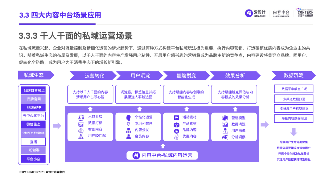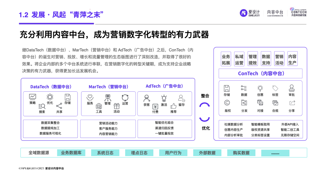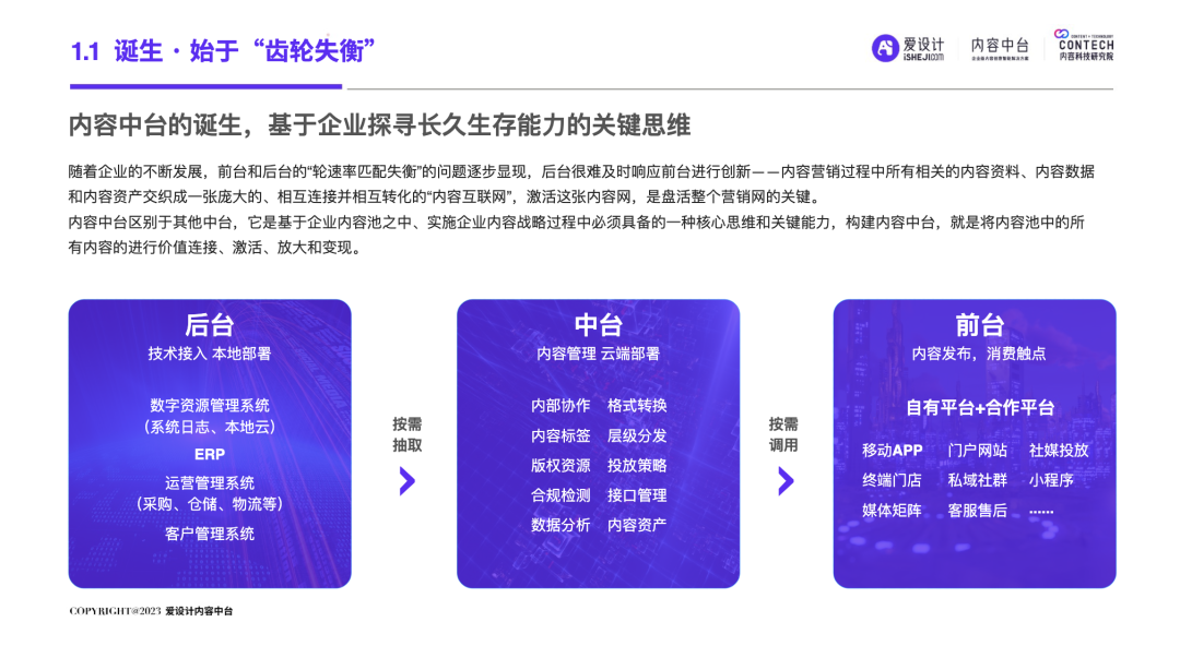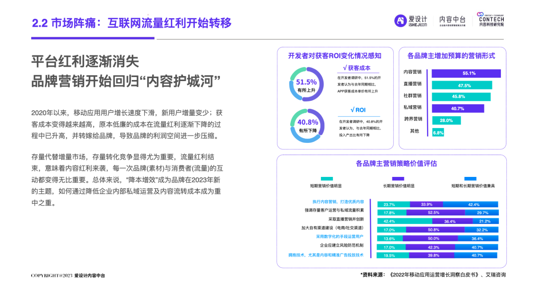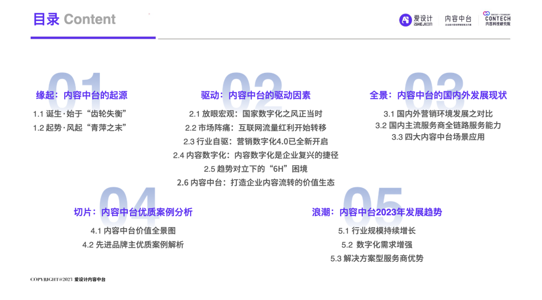 中国的移动互联网进程分为两个阶段:一个是增量期,一个是存量期。自2019年中国移动互联网用户发展见顶,叠加疫情双重因素的影响,数字化发生了重大变化:增量时代,中国市场,成长为一个产业链完善、企业营收规模庞大的商业帝国;狂奔之后,我国内外部经济运行环境十分复杂,企业面临消费增速放缓的压力,中国进入存量时代。在存量时代,企业营销面临的优质流量的存量竞争局面,围绕“效率”的厮杀日益激烈,长远可持续的降本增效成为企业发展的重要课题。渠道数字化、产品数字化已经被无数企业验证及应用,但唯独内容数字化成为一块“最难啃的骨头”!好消息是:一场针对AI的‘完美风暴’正在内容智造领域形成!也许未来,就会是AIGC的时代,而AI是现在以及未来直接生产内容的重要技术形式之一。企业创建强大的内容力,提前建设内容中台,成为每个伟大企业的必由之路。正如iPhone颠覆了手机行业,埃隆马斯克引领下的Open AI利用ChatGPT已经打开了内容生产的新形势!“不做数字化转型的企业就会在五年内消失”的预言到底会不会也成为现实?未来,企业的营销内容如何做?内容内外部流转效率如何提升?日前,由爱设计内容中台发起的内容科技研究院,联合微梦传媒、执牛耳、视觉中国、神策数据、科特勒增长实验室、见实科技、弯弓Digital、流量池研究所、极客邦、胖鲸、第一新声、馒头商学院、决策者零售研究院、Fmarketing、iDigital China、Digital Frontier首席数字官、鸟哥笔记、TopMarketing……(排名不分先后)共同发布《2023企业内容中台白皮书 》(以下简称“白皮书”)。白皮书深入洞察营销数字化趋势,基于一定数量的数据样本,整合了内容中台的市场化表现,旨在为企业主2023年数字化转型提供内容中台的信息支持,为企业营销深度赋能。目录: