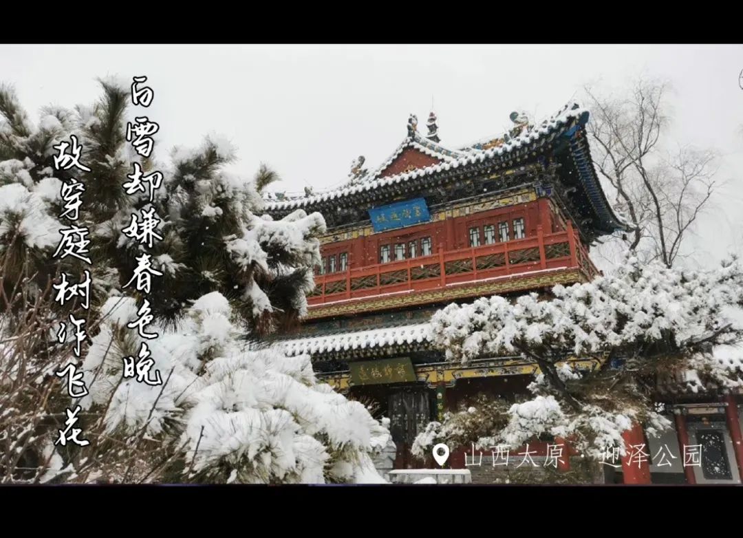 “大雪压青松,青松挺且直”的景观,便是雪后的迎泽公园。雪景和古建筑完美地融为一体,有种梦回古世华夏的错觉。在银装素裹中,亭台楼阁与树木湖泊相映,宛如寂静的水墨画一般惊艳。