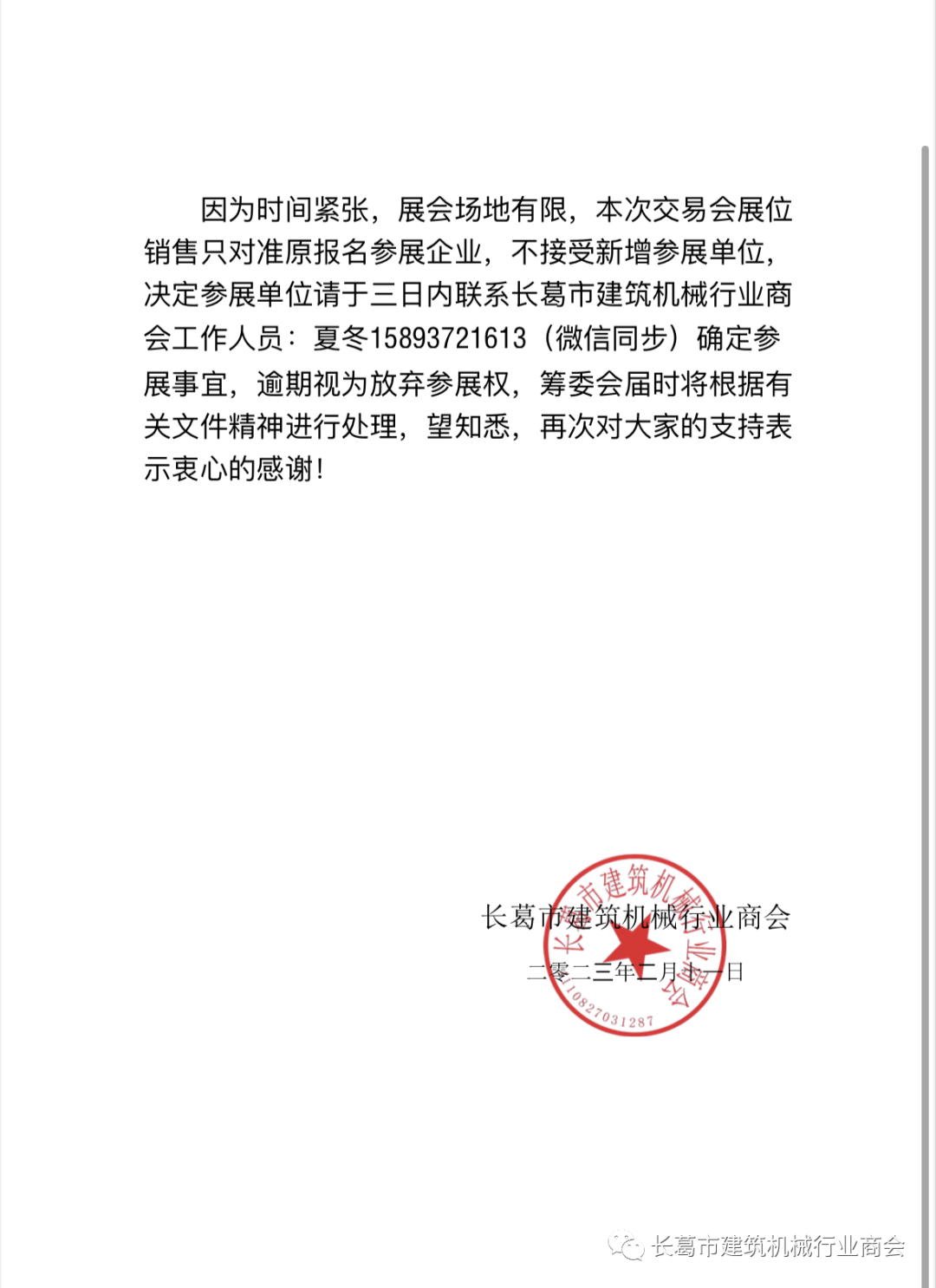 因为时间紧张,展会场地有限,本次交易会展位销售只对准原报名参展企业,不接受新增参展单位,决定参展单位请于三日内联系长葛市建筑机械行业商会工作人员:夏冬15893721613(微信同步)确定参展事宜,逾期视为放弃参展权,筹委会届时将根据有关文件精神进行处理,望知悉,再次对大家的支持表示衷心的感谢!