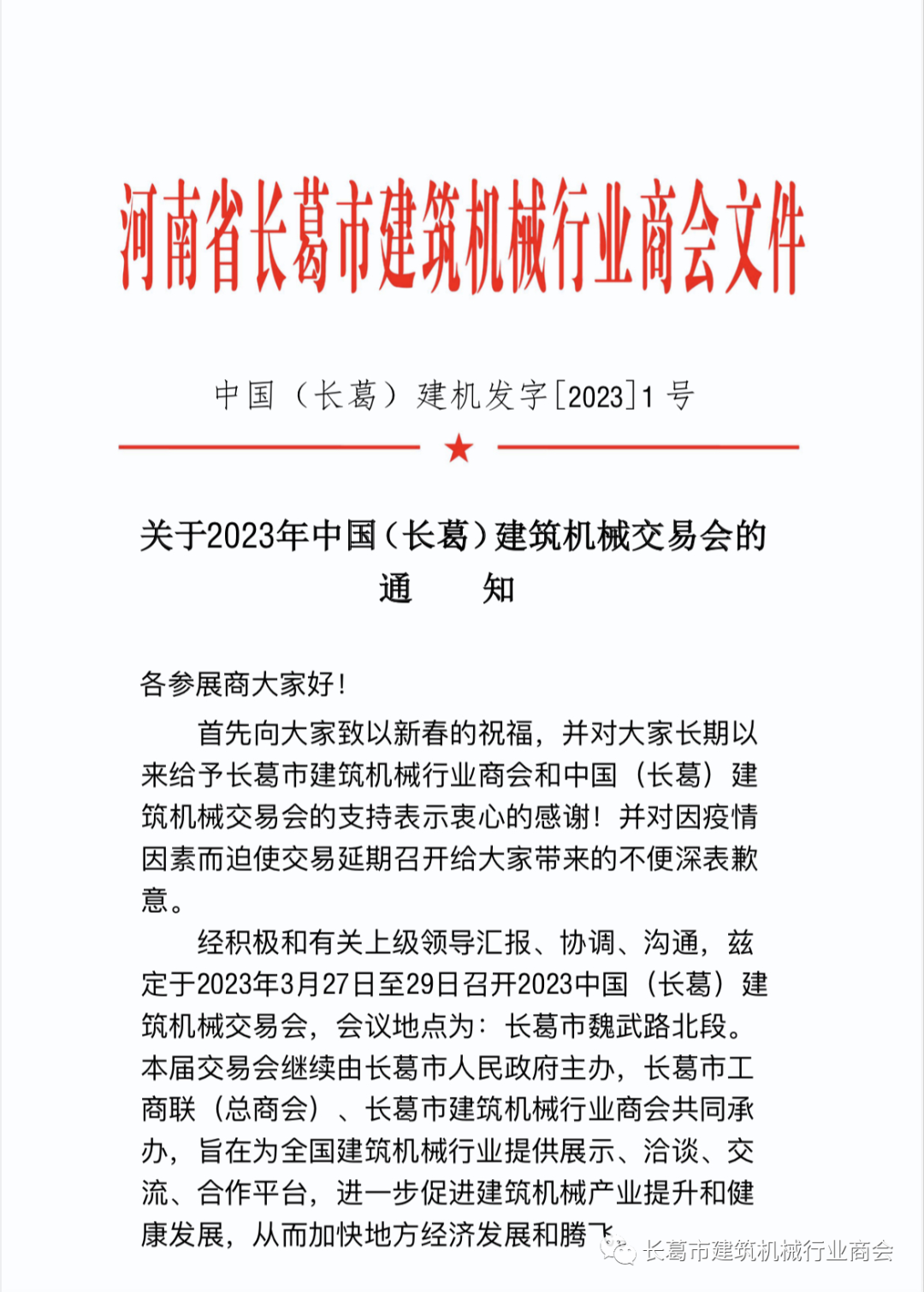 首先向大家致以新春的祝福,并对大家长期以来给予长葛市建筑机械行业商会和中国(长葛)建筑机械交易会的支持表示衷心的感谢!并对因疫情因素而迫使交易延期召开给大家带来的不便深表歉意。