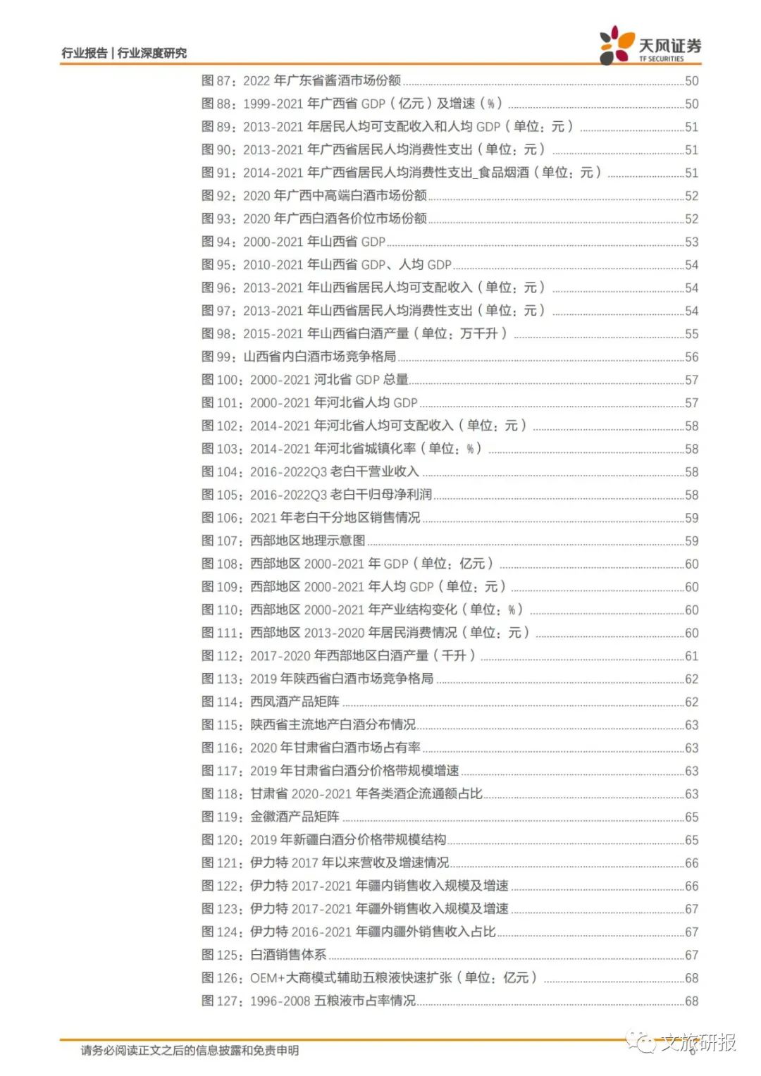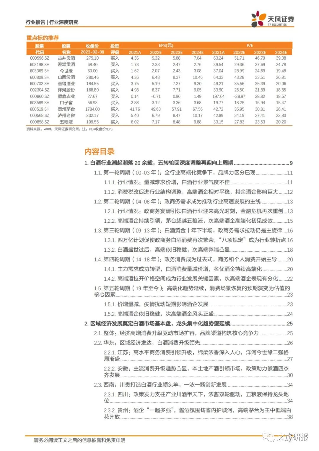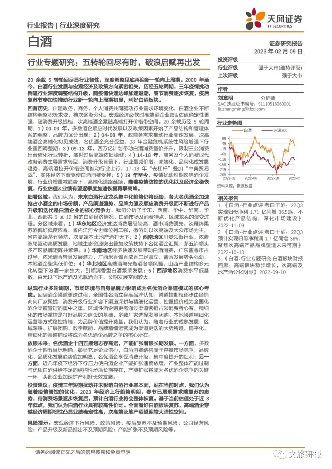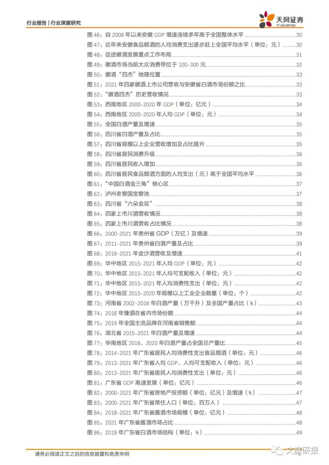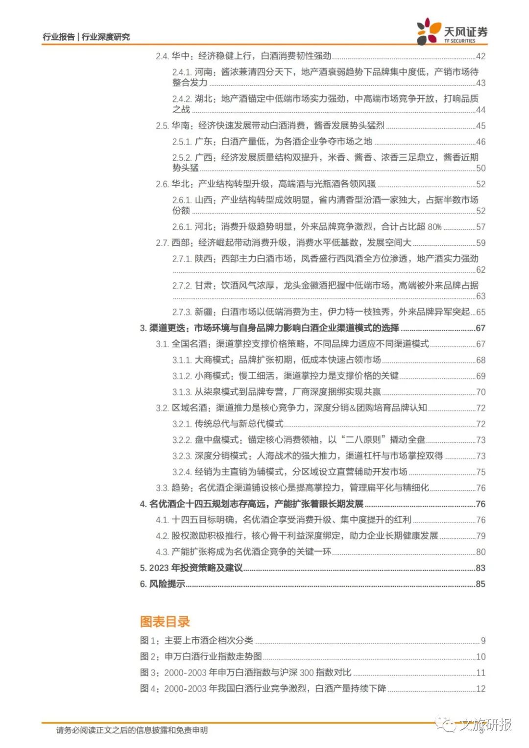20 余载 5 转轮回尽显行业韧性,深度调整见底再迎新一轮向上周期。2000 年至今,白酒行业发展与宏观经济及政策方向紧密相关,历经五轮周期,三年疫情扰动倒逼行业深度调整结构升级,随疫情快速达峰加速退潮,春节消费逐步恢复,疫后复苏节奏加快推动行业新一轮向上周期初显,利好白酒板块。回首历史,伴随政务、商务、个人消费共同驱动行业需求环境变化,白酒企业不断结构调整积极求变,档次逐渐分化。宏观经济疲软时高端酒企业绩&估值确定性更强,随消费升级提档,次高端酒企紧随高端打开价格带空间。20 余载历经 5 轮周期:1)00-03 年,多数酒企顺应时代发展以及政策因素开始了产品结构和管理体系的调整,品牌力区分出现;2)04-08 年,政商务需求推动行业高速发展,次高端酒企高端化初见成效,名优酒企充分受益,08 年金融危机系统性风险增强下行业重回调整期;3)09-13 年,四万亿计划带动白酒消费量价齐升,限制三公消费出台催化行业转折,盛世过后高端依旧稳健;4)14-18 年,商务及个人消费取代政务消费主导需求转型,消费升级背景下,行业量减价增、高端化、品牌化成发展趋势,高端酒拉开价格空间推动行业上行,17-18 年“去杠杆”叠加“中美贸易战”,实体经济下滑驱使白酒消费受挫;5)19 年至今,疫情扰动短期影响酒企发展,行业价增量减趋势下,高端化道路延续,随着疫情防控的优化以及经济企稳恢复,行业估值&业绩有望逐季度加速恢复再攀高峰。细看区域:我们认为,未来白酒行业龙头集中化趋势仍将延续,各大名优酒企加速抢占小酒企的市场份额,产品渠道强势、品牌力强及顺应消费升级而不断进行产品升级和迭代是白酒企业的核心竞争力。我们分析了华东、西南、华中、华南、华北、西部共 6 区 12 省的白酒经济情况、白酒市场及消费特点、区域龙头的演变过程。分区域来看,1)华东地区经济发达消费层级较高,酒市消费领先,淡雅绵柔苏酒偏好低度浓香,省内洋河今世缘位列二强,徽酒则以次高端及大众市场为主,省内高端茅五领航,次高端本土地产酒打天下;2)西南地区川贵领衔行业,浓酱双轮驱动高质发展,地域生态资源突出叠加政策扶持下名优酒企汇聚,茅五泸领头多产区品牌矩阵共繁荣;3)华南地区经济快速发展带动白酒消费,广东酱香市占过半,浓米清香皆具发展潜力,广西米香酱香浓香三足鼎立,酱香发展势头强劲,本地酒企聚焦低价位;4)华北地区高端酒与光瓶酒各领风骚,山西产业结构多元化转型下汾酒一家独大,引领清香型白酒繁荣发展;5)西部地区消费水平低基数,百元以下地产酒及光瓶酒为主,长期发展空间较大。纵观行业多轮周期,市场环境与自身品牌力影响成为名优酒企渠道模式的核心考虑。回顾酒企渠道更迭过程,全国性名酒立身高品牌认知,渠道控制权逐步由经销商向厂家聚拢,消费升级行业扩容下渠道深耕与精细化运营、控量提价成为全国化酒企渠道管理的重中之重。区域性酒企则更需通过渠道营销占领消费者心智,精细化的市场掌控是打好品牌力建设的基础,多数厂家选择发展团购、本地渠道精细化运营等方式稳控终端,为品牌价值提升奠基。我们认为,随着行业的成熟发展,区域深耕、扩展团购、数字赋能、品牌精细运营成为渠道更迭的大势所趋,扁平化、精细化的渠道铺设将成为名优酒企品牌之争的核心所在。放眼未来:名优酒企十四五规划志存高远,产能扩张着眼长期发展。一方面,多数酒企十四五目标明确,彰显充足企业信心,白酒消费结构属于存量市场竞争,品牌化、品质化发展趋势愈加明显,名优酒企享受消费升级、集中度提升的红利;另一方面,近几年疫下经济下行压力使白酒企业产能扩张速度放缓,产业整体产能过剩与优质白酒供给不足的结构性矛盾长期存在,产能扩张将成为名优酒企竞争的关键一环,头部企业加速扩产利好长效发展。报告较长,如需要PDF完整版可关注公众号,回复“报告”扫码进群获取,群内每日免费分享文旅大消费产业研究报告。