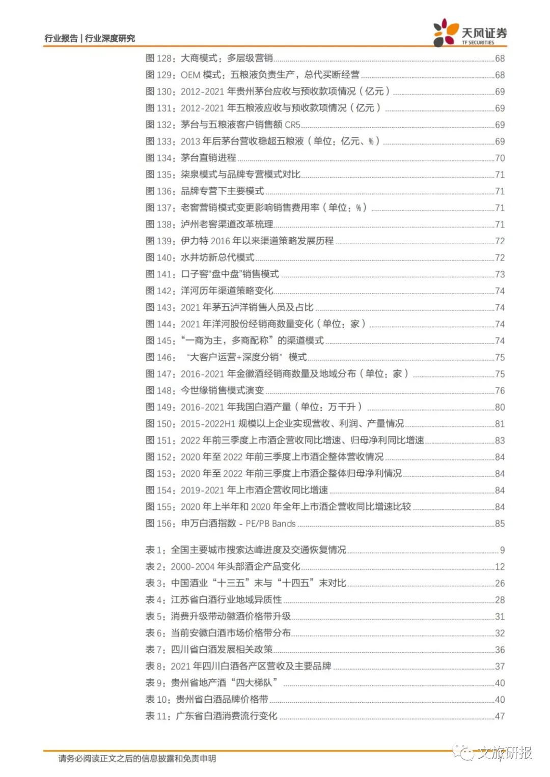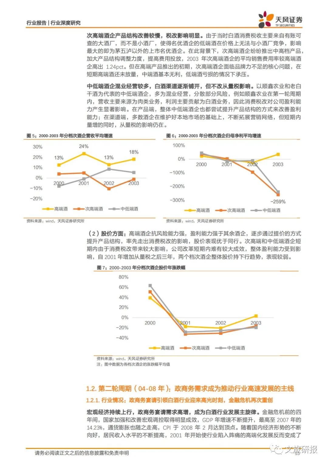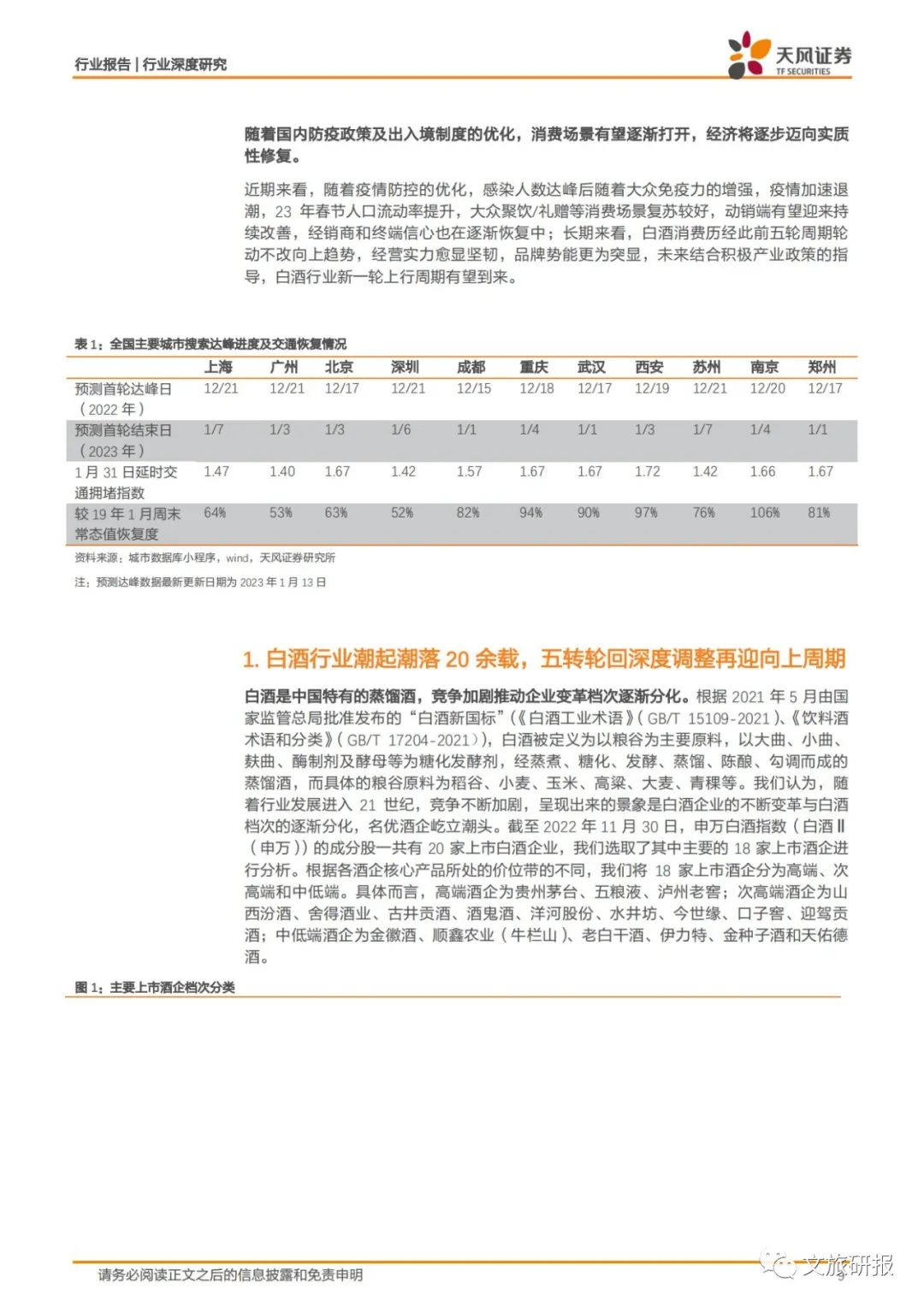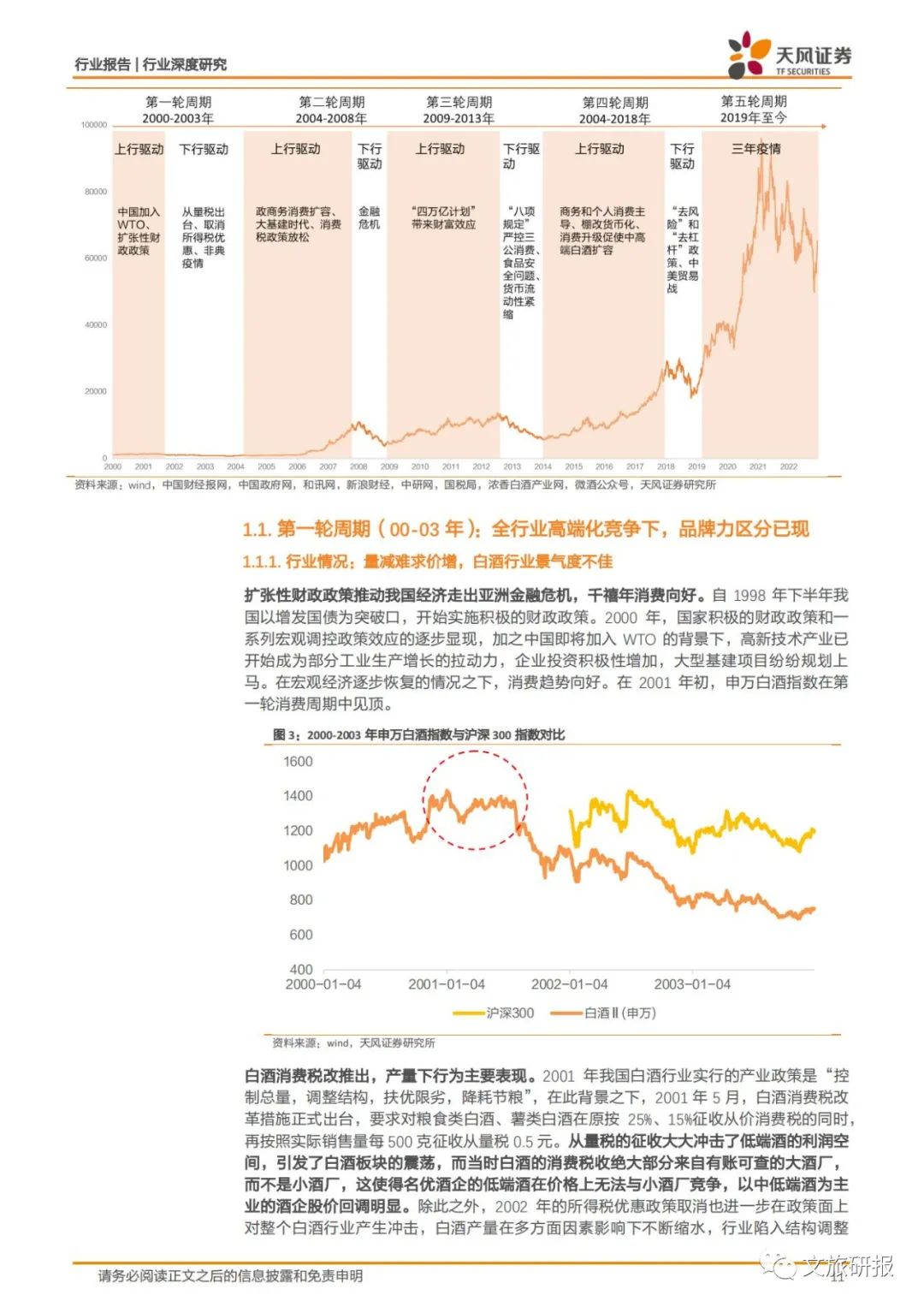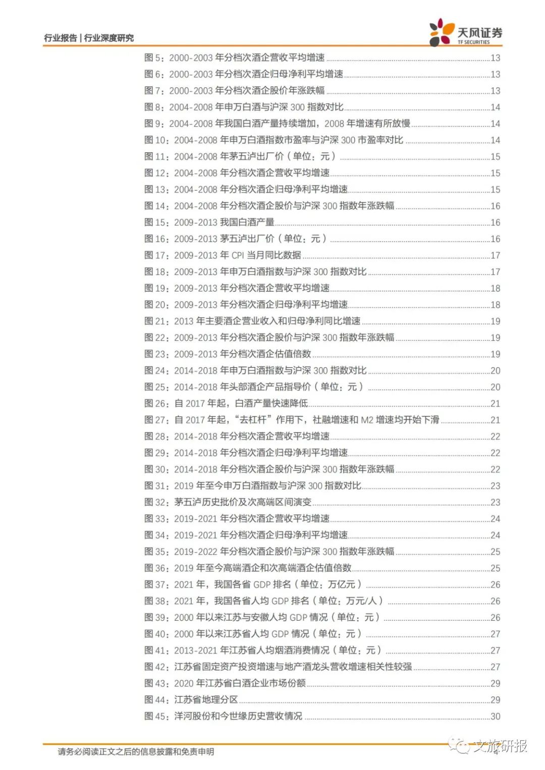 20 余载 5 转轮回尽显行业韧性,深度调整见底再迎新一轮向上周期。2000 年至今,白酒行业发展与宏观经济及政策方向紧密相关,历经五轮周期,三年疫情扰动倒逼行业深度调整结构升级,随疫情快速达峰加速退潮,春节消费逐步恢复,疫后复苏节奏加快推动行业新一轮向上周期初显,利好白酒板块。回首历史,伴随政务、商务、个人消费共同驱动行业需求环境变化,白酒企业不断结构调整积极求变,档次逐渐分化。宏观经济疲软时高端酒企业绩&估值确定性更强,随消费升级提档,次高端酒企紧随高端打开价格带空间。20 余载历经 5 轮周期:1)00-03 年,多数酒企顺应时代发展以及政策因素开始了产品结构和管理体系的调整,品牌力区分出现;2)04-08 年,政商务需求推动行业高速发展,次高端酒企高端化初见成效,名优酒企充分受益,08 年金融危机系统性风险增强下行业重回调整期;3)09-13 年,四万亿计划带动白酒消费量价齐升,限制三公消费出台催化行业转折,盛世过后高端依旧稳健;4)14-18 年,商务及个人消费取代政务消费主导需求转型,消费升级背景下,行业量减价增、高端化、品牌化成发展趋势,高端酒拉开价格空间推动行业上行,17-18 年“去杠杆”叠加“中美贸易战”,实体经济下滑驱使白酒消费受挫;5)19 年至今,疫情扰动短期影响酒企发展,行业价增量减趋势下,高端化道路延续,随着疫情防控的优化以及经济企稳恢复,行业估值&业绩有望逐季度加速恢复再攀高峰。细看区域:我们认为,未来白酒行业龙头集中化趋势仍将延续,各大名优酒企加速抢占小酒企的市场份额,产品渠道强势、品牌力强及顺应消费升级而不断进行产品升级和迭代是白酒企业的核心竞争力。我们分析了华东、西南、华中、华南、华北、西部共 6 区 12 省的白酒经济情况、白酒市场及消费特点、区域龙头的演变过程。分区域来看,1)华东地区经济发达消费层级较高,酒市消费领先,淡雅绵柔苏酒偏好低度浓香,省内洋河今世缘位列二强,徽酒则以次高端及大众市场为主,省内高端茅五领航,次高端本土地产酒打天下;2)西南地区川贵领衔行业,浓酱双轮驱动高质发展,地域生态资源突出叠加政策扶持下名优酒企汇聚,茅五泸领头多产区品牌矩阵共繁荣;3)华南地区经济快速发展带动白酒消费,广东酱香市占过半,浓米清香皆具发展潜力,广西米香酱香浓香三足鼎立,酱香发展势头强劲,本地酒企聚焦低价位;4)华北地区高端酒与光瓶酒各领风骚,山西产业结构多元化转型下汾酒一家独大,引领清香型白酒繁荣发展;5)西部地区消费水平低基数,百元以下地产酒及光瓶酒为主,长期发展空间较大。纵观行业多轮周期,市场环境与自身品牌力影响成为名优酒企渠道模式的核心考虑。回顾酒企渠道更迭过程,全国性名酒立身高品牌认知,渠道控制权逐步由经销商向厂家聚拢,消费升级行业扩容下渠道深耕与精细化运营、控量提价成为全国化酒企渠道管理的重中之重。区域性酒企则更需通过渠道营销占领消费者心智,精细化的市场掌控是打好品牌力建设的基础,多数厂家选择发展团购、本地渠道精细化运营等方式稳控终端,为品牌价值提升奠基。我们认为,随着行业的成熟发展,区域深耕、扩展团购、数字赋能、品牌精细运营成为渠道更迭的大势所趋,扁平化、精细化的渠道铺设将成为名优酒企品牌之争的核心所在。放眼未来:名优酒企十四五规划志存高远,产能扩张着眼长期发展。一方面,多数酒企十四五目标明确,彰显充足企业信心,白酒消费结构属于存量市场竞争,品牌化、品质化发展趋势愈加明显,名优酒企享受消费升级、集中度提升的红利;另一方面,近几年疫下经济下行压力使白酒企业产能扩张速度放缓,产业整体产能过剩与优质白酒供给不足的结构性矛盾长期存在,产能扩张将成为名优酒企竞争的关键一环,头部企业加速扩产利好长效发展。报告较长,如需要PDF完整版可关注公众号,回复“报告”扫码进群获取,群内每日免费分享文旅大消费产业研究报告。