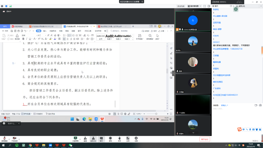 2023年2月10日下午,广东省燃气采暖热水炉商会于线上召开了商会营销工作委员会2023年度第一次工作会议,商会会长、迪森董事长李祖芹,商会营销工作委员会主任委员、阿诗丹顿总经理谌厚榕,商会秘书长楼英,营销工作委员会成员30余人参与会议。商会执行会长、海顿董事长邱国利列席会议。会议由商会副秘书长谢毓玟主持。